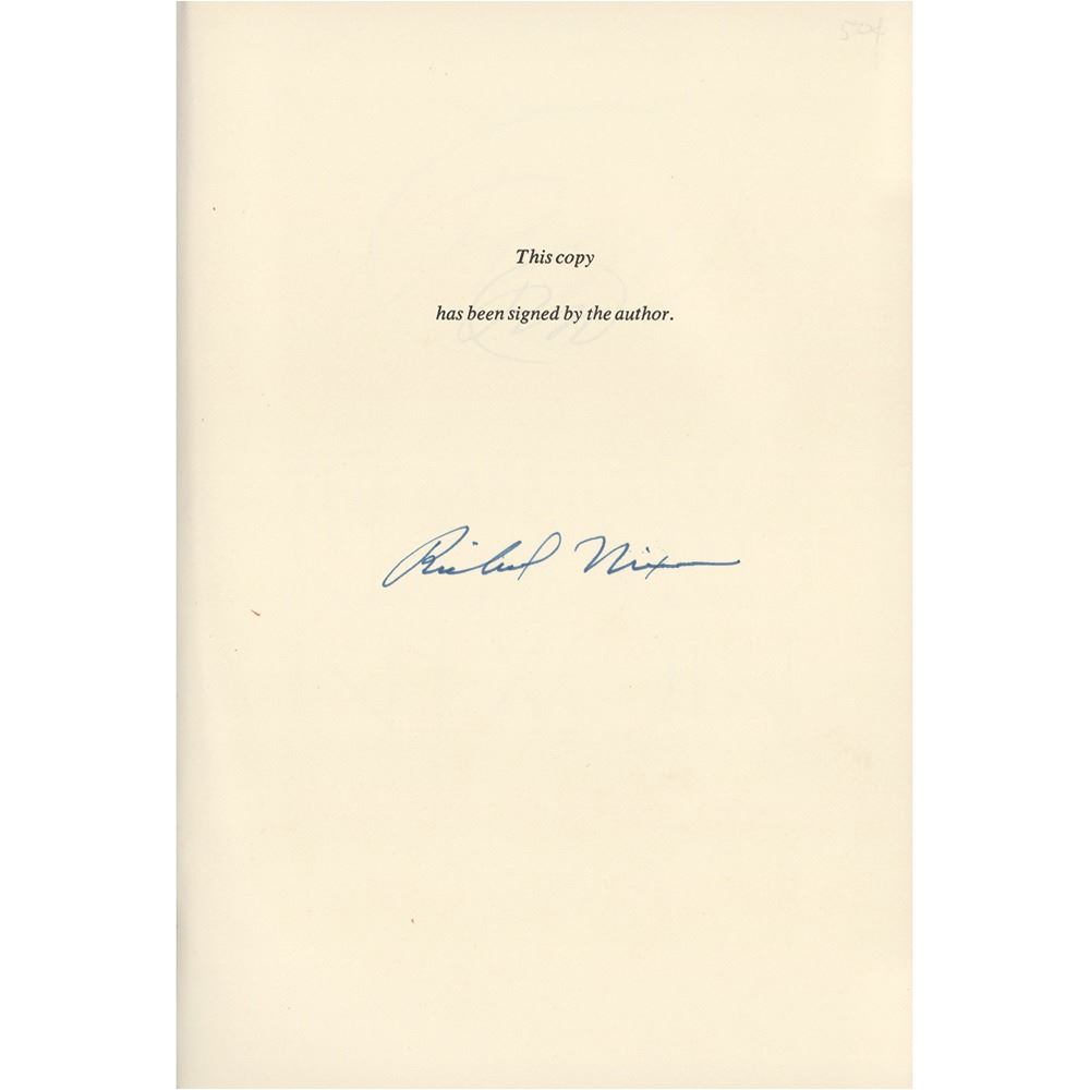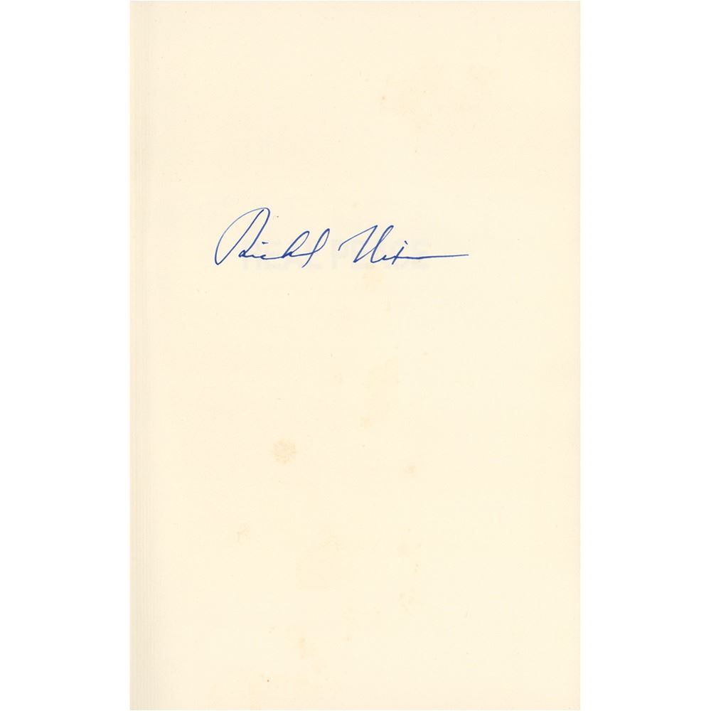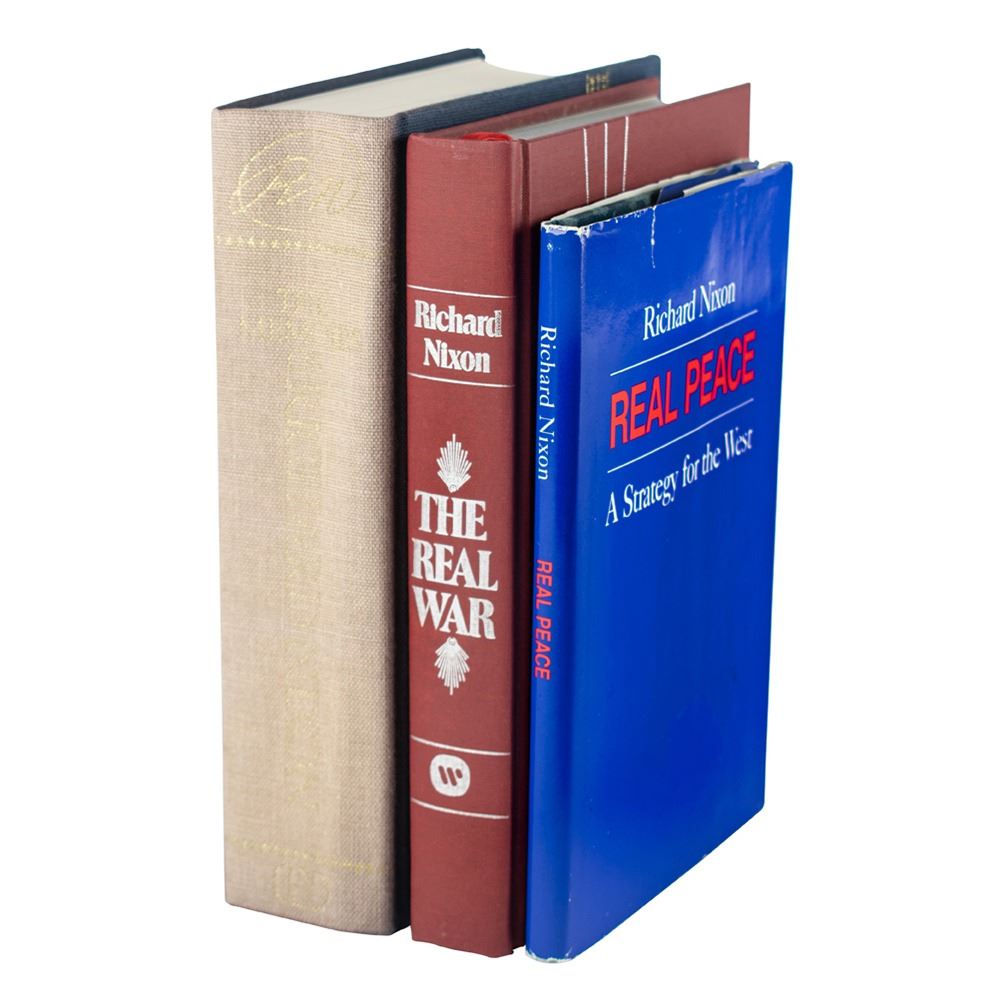 Three first edition books signed by Nixon: The Memoirs of Richard Nixon, hardcover, published by Grosset & Dunlap in 1978, signed on the colophon in ink; The Real War, hardcover with slipcase, published by Warner Books in 1980, signed on the colophon in ballpoint; and Real Peace: A Strategy for the West, hardcover with dust jacket, privately printed in 1983, signed on the first free end page in felt tip. In overall very good condition, with sunning to the spine of Memoirs, some spotting to boards of The Real War (and signature a shade light), and some small tears to the dust jacket of Real Peace. Real Pace is accompanied by a card stating that it is one of a limited number sent to US Medal of Honor recipients and Vietnam POWs.