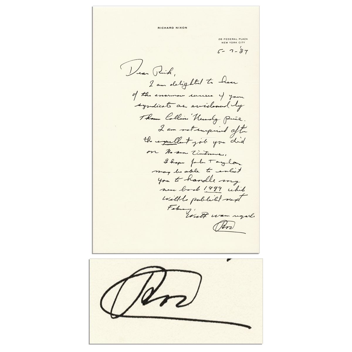 Richard Nixon autograph letter signed on his personal stationery. Dated 7 May 1987 and penned in sharp black ink, letter reads in full: ''Dear Rick, I am delighted to hear of the enormous success of your syndicate as evidenced by Thomas Collins' [?] piece. I am not surprised after the excellent job you did on No More Vietnams. I hope John Taylor [Nixon's aide] may be able to enlist you to handle my new book 1999 which will be published next February. With warm regards, RN''. Single page letter measures 7'' x 10.25''. Near fine condition. Mounted to a paper board and framed by black matte board in fine condition to an overall size of 11'' x 14.5''.