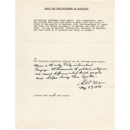 <B>Richard Nixon Autograph Quotation Signed</B></I> "<I>Richard Nixon</B></I>". One page, 8.5" x 11", May 29, 1978, plain paper, black ink. A unique and fascinating autograph quotation signed by Richard Nixon. Headed "Sheet For Your Statement Or Quotation". A correspondent has sent Nixon a printed page asking for a statement, quote, or comment on the meaning of music to his life. Nixon has used the lower portion to handwrite the following, in full: "<I>Music is the only truly international language. It transcends the political, religious, and racial differences which divide people and helps bring them together. Richard Nixon May 29, 1978</B></I>". Very fine condition.<BR><BR><b>Shipping:</b> Flat Material, Small (<a target="_blank" href="http://www.heritageauctions.com/common/shipping.php">view shipping information</a>)