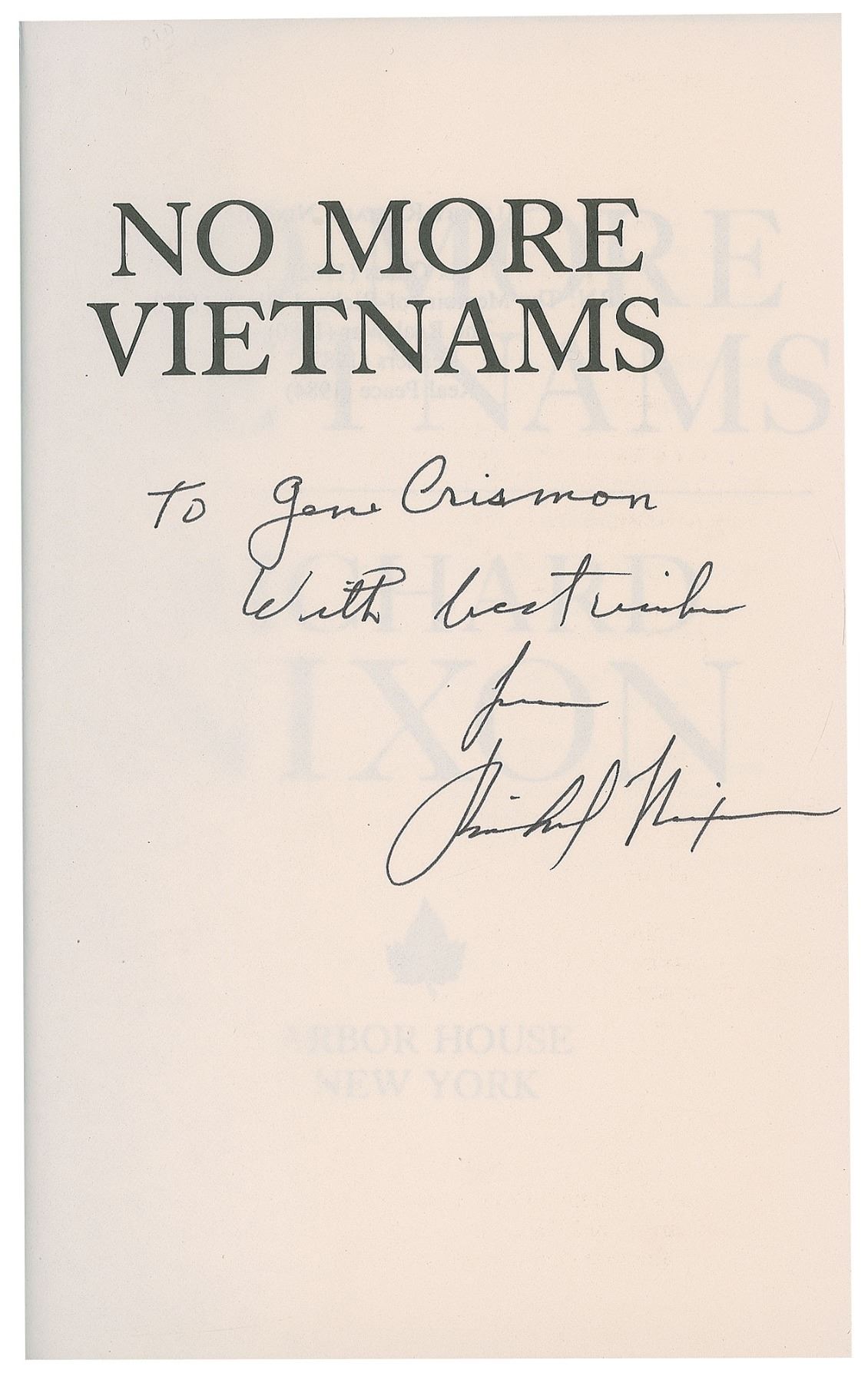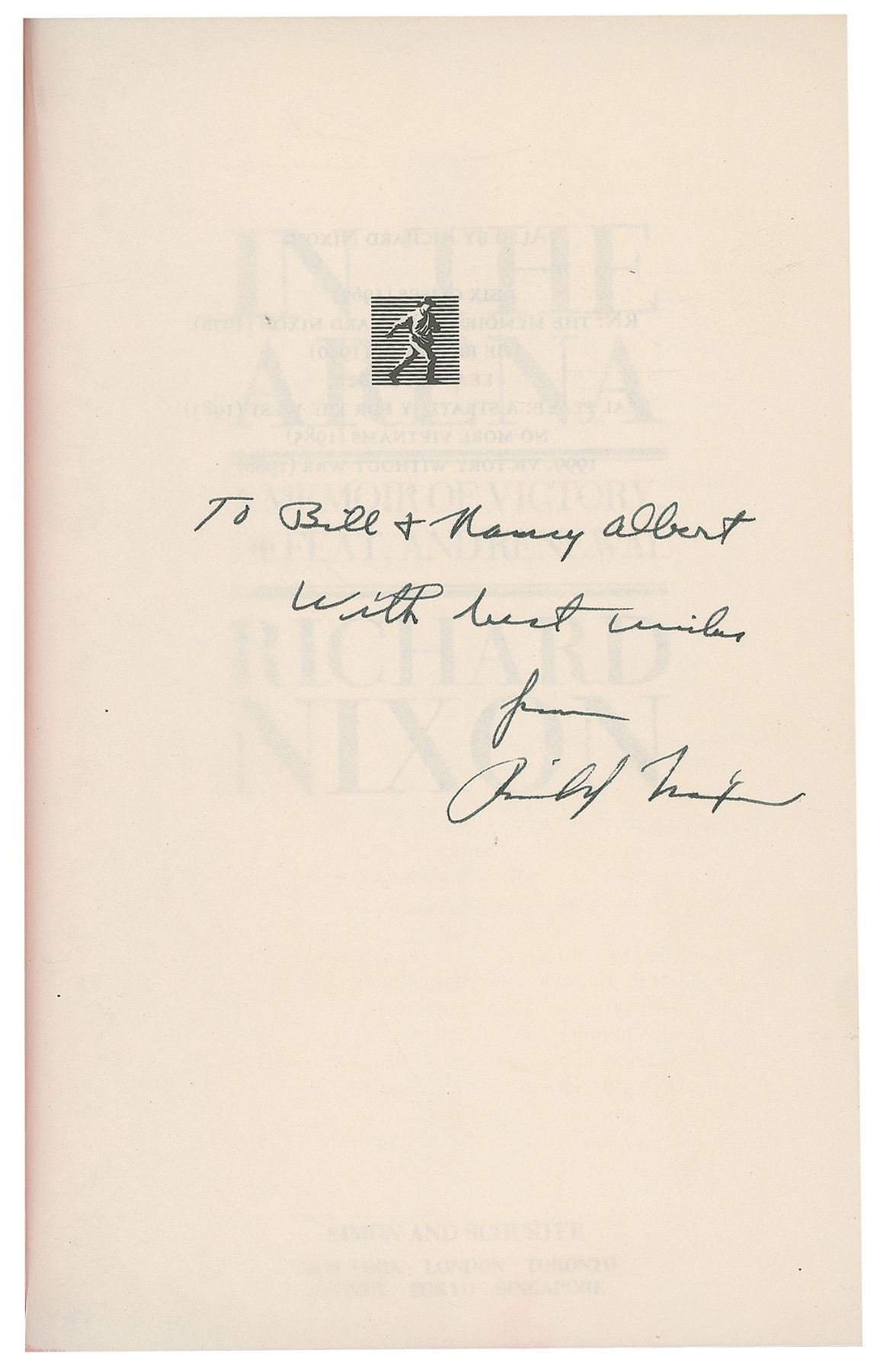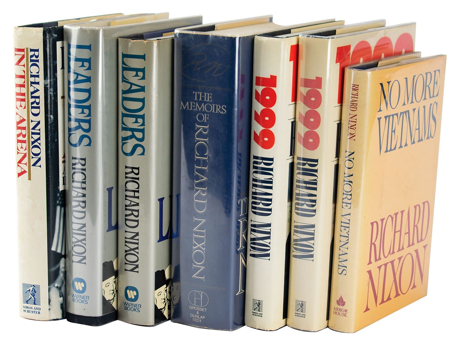 Seven first edition books signed and inscribed inside by Richard Nixon, all hardcovers with dust jackets. Titles are: The Memoirs of Richard Nixon, In the Arena, No More Vietnams, Leaders (2), and 1999 (2). In overall very good to fine condition.