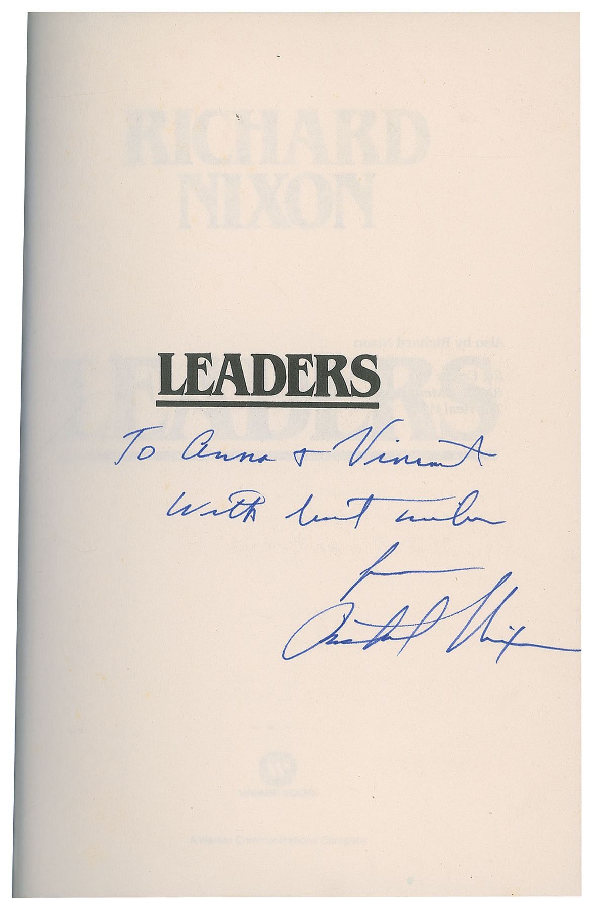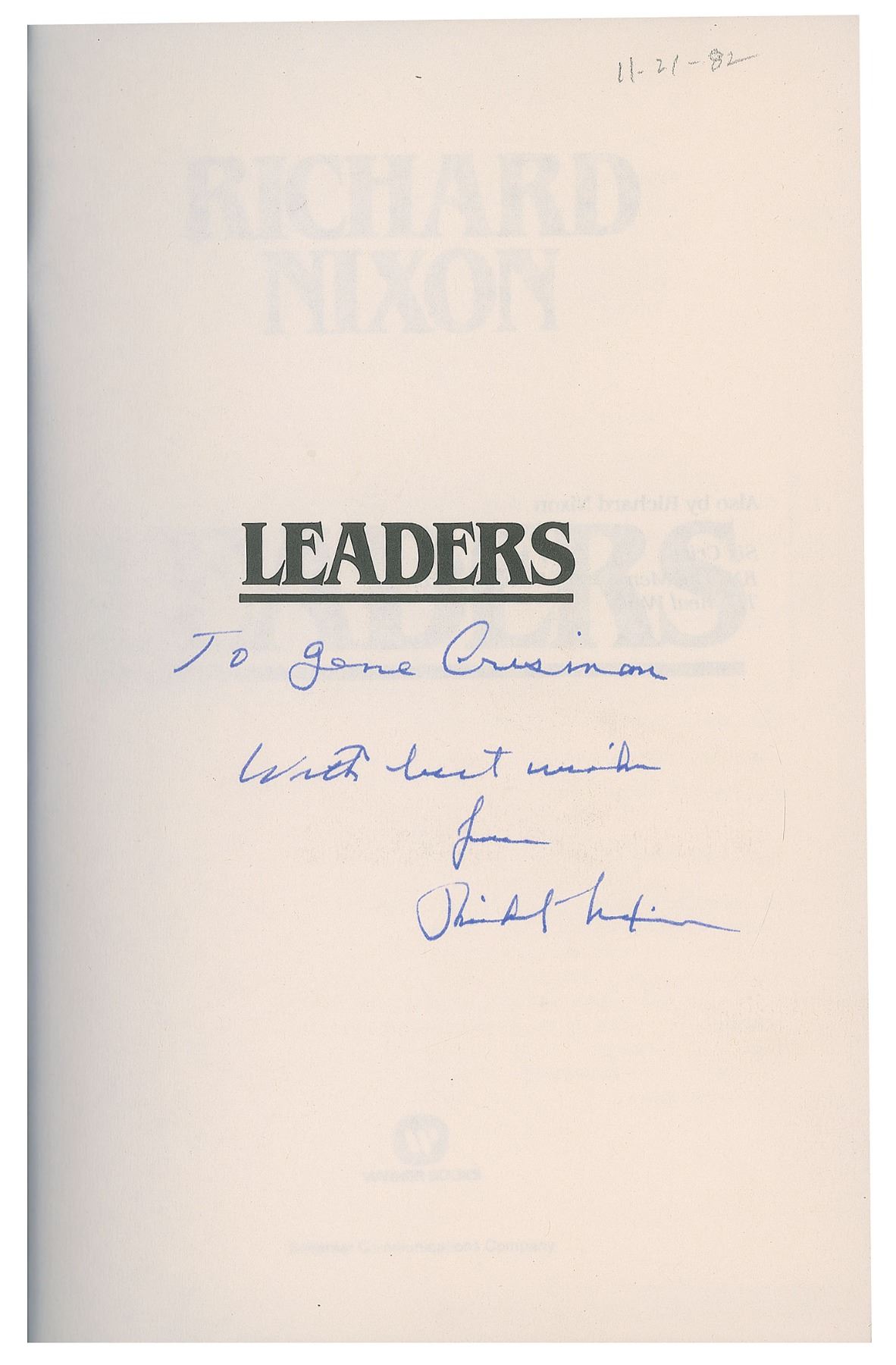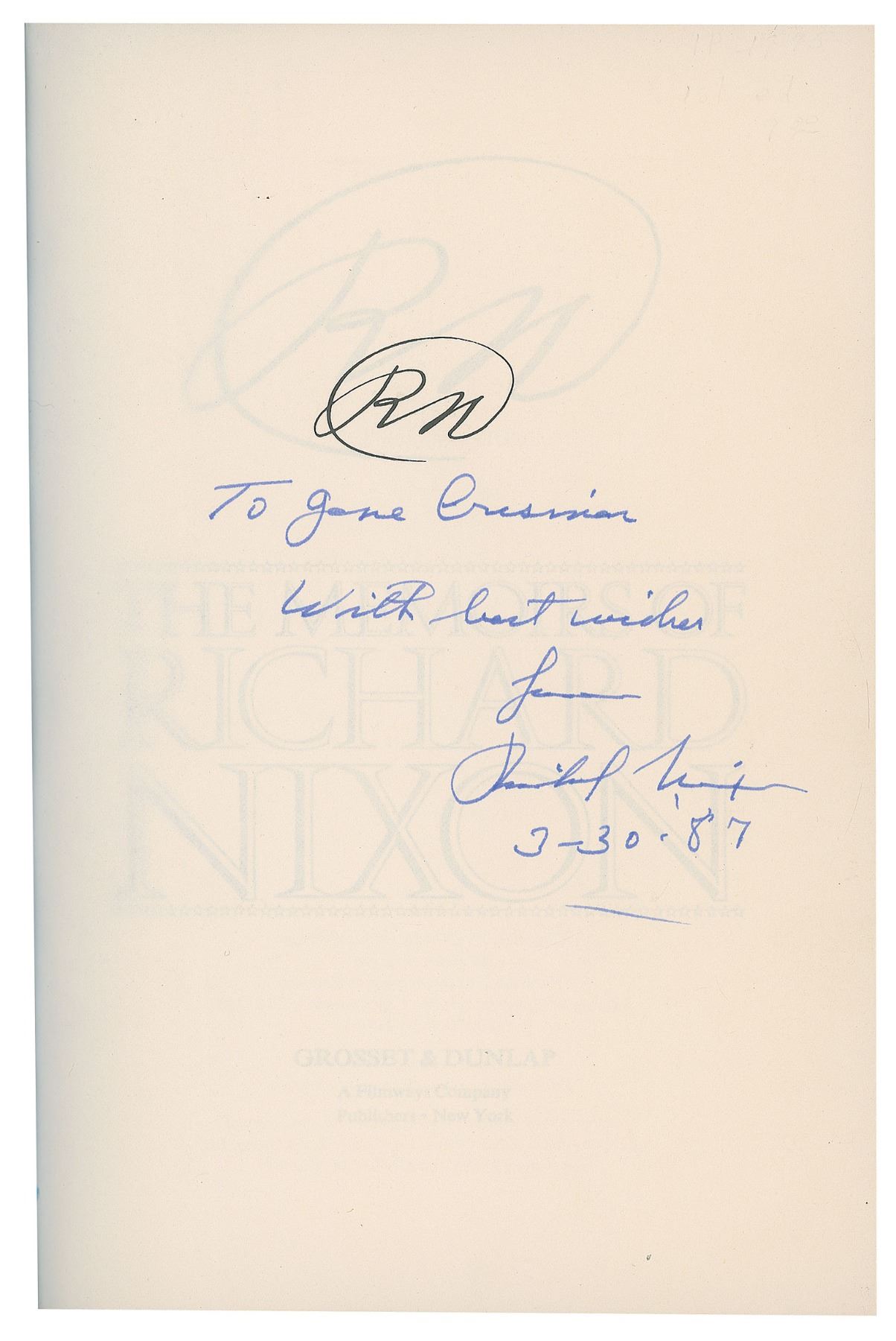 Seven first edition books signed and inscribed inside by Richard Nixon, all hardcovers with dust jackets. Titles are: The Memoirs of Richard Nixon, In the Arena, No More Vietnams, Leaders (2), and 1999 (2). In overall very good to fine condition.