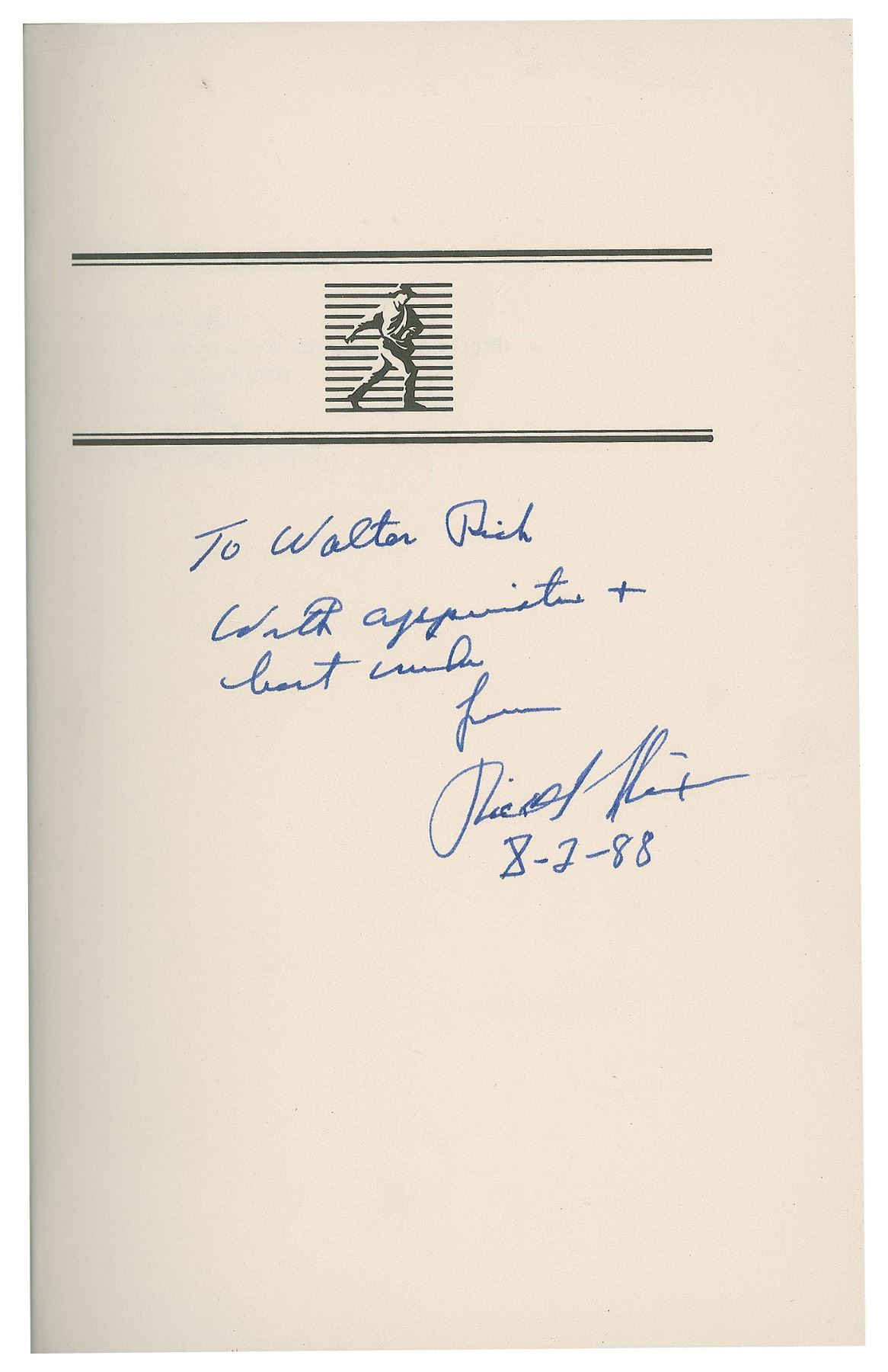 All lots sold by RR Auction are accompanied by an Auction Certificate ("AC”). On any lot presented with an AC issued by RR Auction, the certification is only as to its attribution to the person or entity described or to the lot's usage and only as explicitly stated therein (the "Certification of Authenticity”), to the exclusion of any other warranties, express or implied, including but not limited to those pursuant to the Uniform Commercial Code. The Certification of Authenticity inures only to the original Bidder (as shown in RR Auction's records). Bidder may not transfer, assign, or otherwise convey the Certification of Authenticity, and such purported transfer, assignment, or conveyance shall be null and void. The Certification of Authenticity is valid from date of the Auction in which Bidder was awarded the lot (the "Auction Date”) until five (5) years after the Auction Date, without exception.