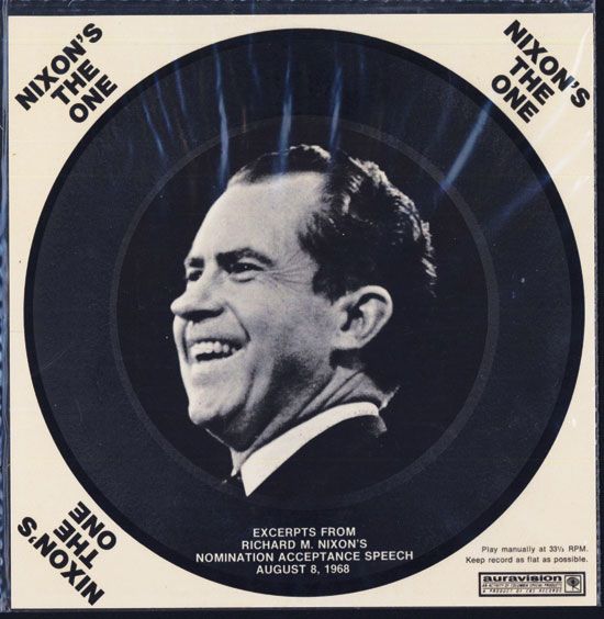 1968, 33 1/3 rpm recording of portion of Nixon's 1968 acceptance speech used as campaign material, record on cardboard in sealed plastic, VF condition.