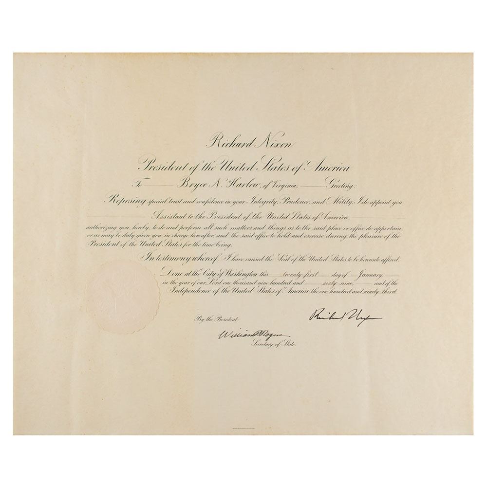 Scarce partly-printed DS as president, one page, 23 x 19, January 21, 1969. President Nixon appoints Bryce N. Harlow of Virginia as "Assistant to the President of the United States of America." Signed boldly at the conclusion by Richard Nixon, and countersigned by Secretary of State William P. Rogers. The large beige paper seal, which is exhibiting some slight peeling, remains affixed to the lower left. Rolled and in fine condition, with three light vertical folds.