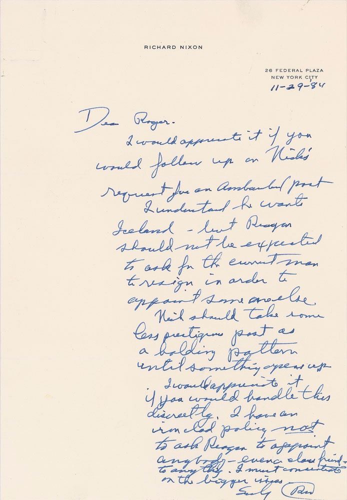 Uncommon ALS signed “RN,” one page, 7.25 x 10.5, personal letterhead, November 29, 1984. Letter to Roger, in full: "I would appreciate it if you would follow up on Nick's request for an ambassadorial post. I understand he wants Iceland—but Reagan should not be expected to ask for the current man to resign in order to appoint someone else. Nick should take some less prestigious post as a holding pattern until something opens up. I would appreciate it if you would handle this discreetly. I have an ironclad policy not to ask Reagan to appoint anybody—even a close friend—to anything. I must concentrate on the bigger issues." In fine condition, with two light paperclip impressions to the upper left corner.