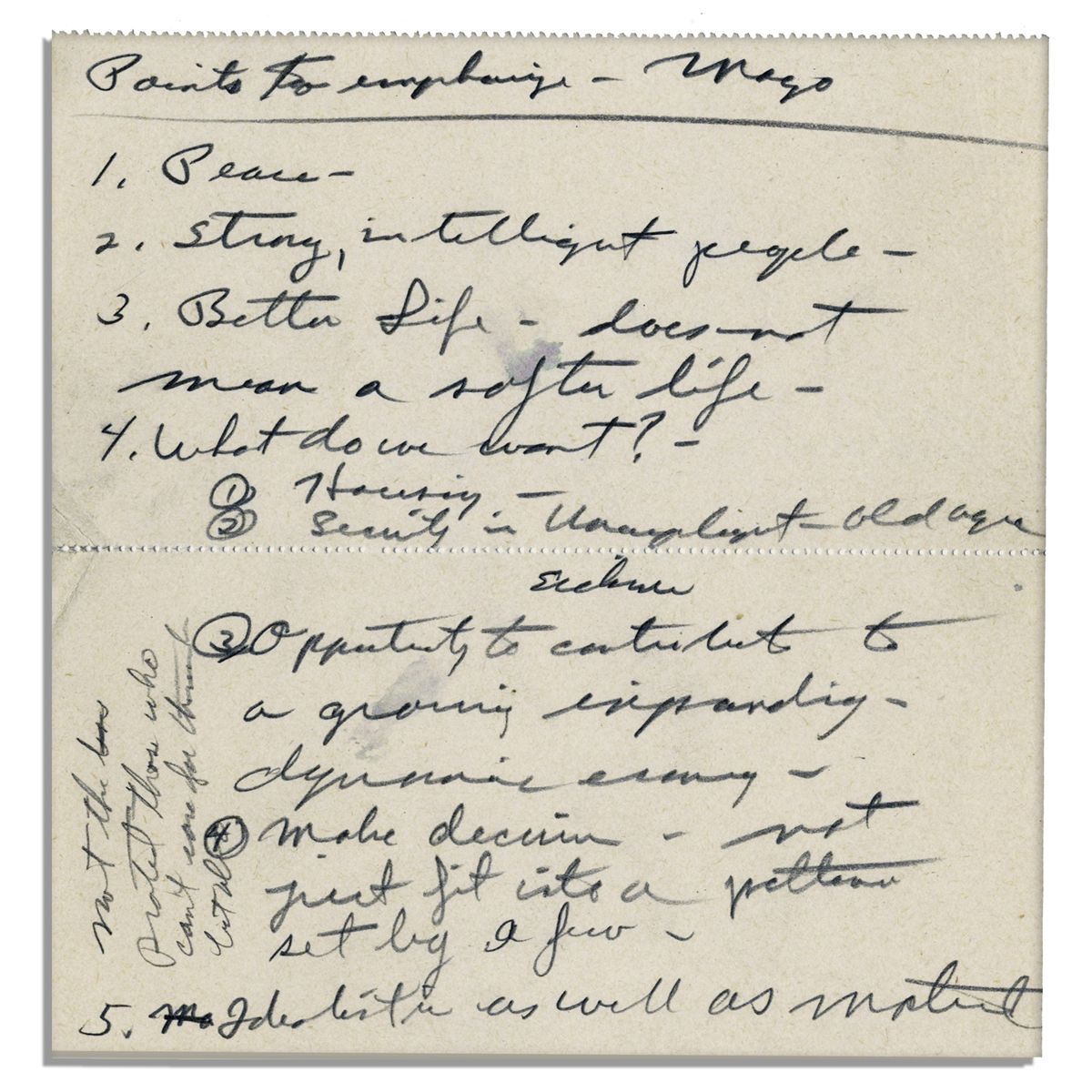 Handwritten notes by President Richard Nixon. Notes are from a collection of handwritten Nixon documents collected by Nixon's biographer and New York Herald Tribune political journalist Earl Mazo, who wrote, ''Richard Nixon: A Political and Personal Portrait''. Published in 1959, the book's source material was written near or before 1958. Nixon was Vice President at the time. This sheet reads in pencil, ''Points to emphasize - [illegible] / 1. Peace - / 2. strong, intelligent people - / 3. Better Life - does not / mean a softer life - 4. What do we want? - / 1) Housing - / 2) Security in [illegible] / 3) Opportunity to contribute to / a growing expanding / dynamic economy - / 4) Make decision - not / just fit into a pattern / set by a few - / 5. Idealistic as well as material''. A note on the side reads, ''not the / protect those who / can't care for them[selves]...'' Runs 1pp. Measures 5.5'' x 5.75''. Perforation runs through center. Two small stains to center. Near fine overall.