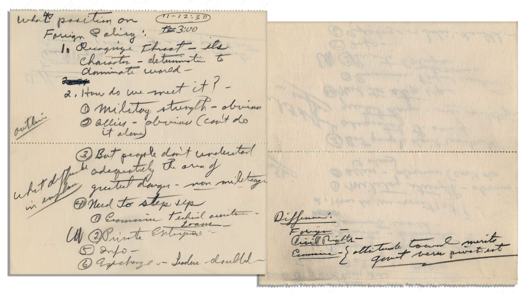 Richard Nixon handwritten notes regarding foreign policy and the communist threat. Notes are from a collection of handwritten Nixon documents collected by Nixon's biographer and New York Herald Tribune political journalist Earl Mazo, who wrote, ''Richard Nixon: A Political and Personal Portrait''. Published in 1959, the book's source material was written near or before 1958, when Nixon was Vice President. Nixon writes in pencil, ''...What position on Foreign Policy: 1. Recognize threat - its character - determination to dominate world - 2. How do we meet it? 1) Military strength - obvious 2) Allies - obvious (can't do it alone) 3) But people don't understand adequately the area of greatest danger - non-military 4) Need to step up 1) Economic Technical assistance - Loans 2) Private Enterprise - 5) Info - 6) Exchange - Leaders - doubled''. Verso reads, ''Differences: Foreign - Civil Rights - Economic - {attitude toward merits / govt versus private set''. Document measures 5.5'' x 5.75''. Near fine condition with perforation through center.