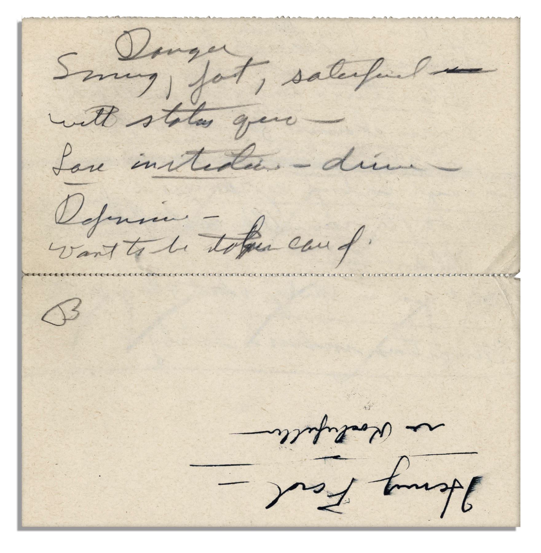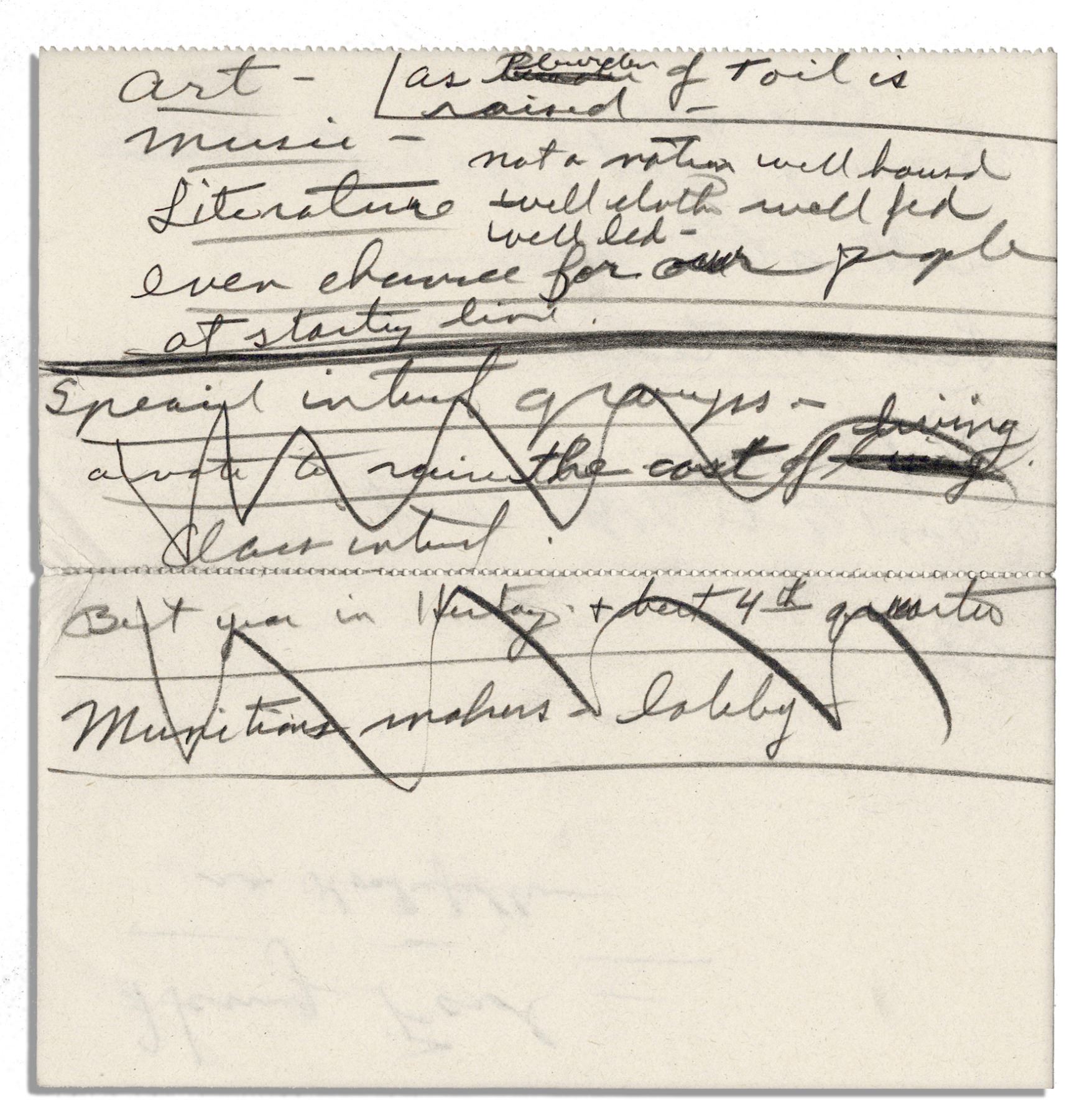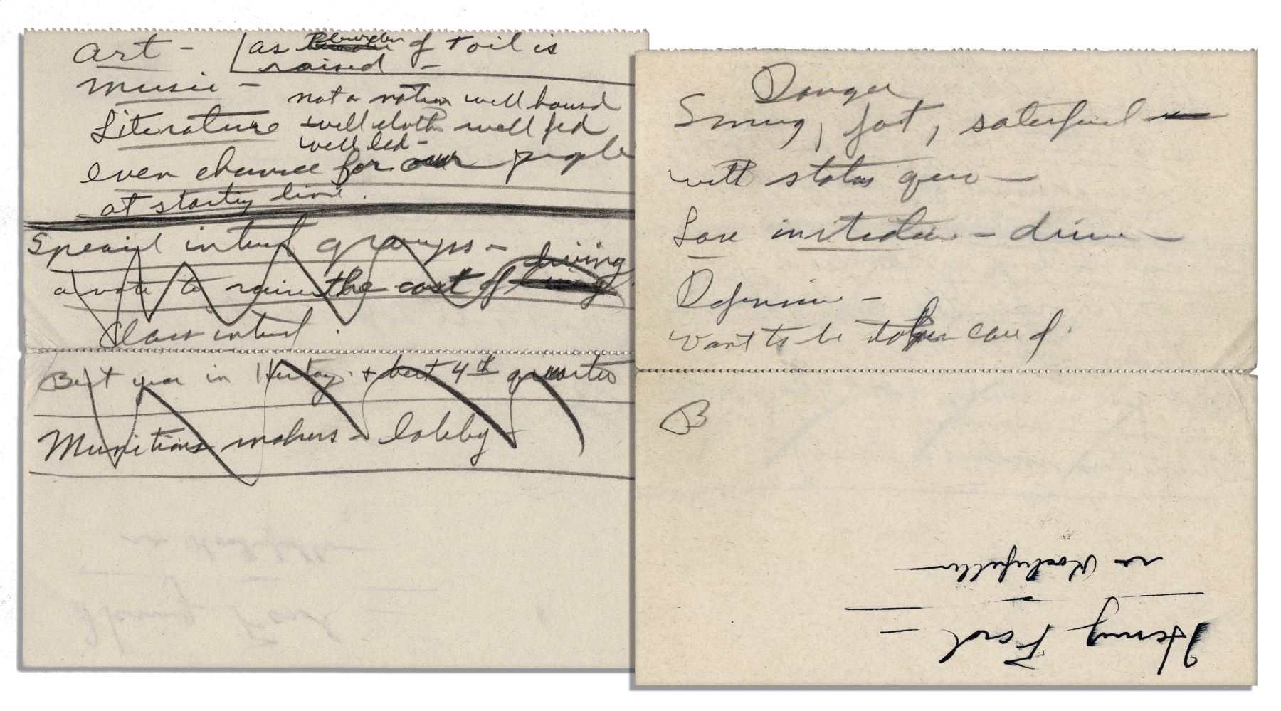 Intriguing handwritten notes by President Richard Nixon. Notes are from a collection of handwritten Nixon documents collected by Nixon's biographer and New York Herald Tribune political journalist Earl Mazo, who wrote, ''Richard Nixon: A Political and Personal Portrait''. Published in 1959, the book's source material was written near or before 1958, when Nixon was Vice President. This sheet features a note in black ink, ''Henry Ford / Rockefeller'' that stands alone on one end of the page. Opposite, penciled notes read, ''Danger / Smug, fat, satisfied with status quo - / Lose initiative - drive - / Defensive - / want to be taken care of.'' Verso reads in pencil, ''Art - / Music / Literature / even chance for our people at starting line / as burden of Toil is raised - / not a nation well housed well clothed well fed well led...'' Crossed out beneath are more notes, ''Special interest groups...a vote to raise the cost of living / class interest / Best year in History + best 4th quarter / Munitions makers - lobby''. Document runs 2pp. on a single sheet. Measures 5.5'' x 5.75''. Perforation runs through center with some separation starting to one end, else near fine.