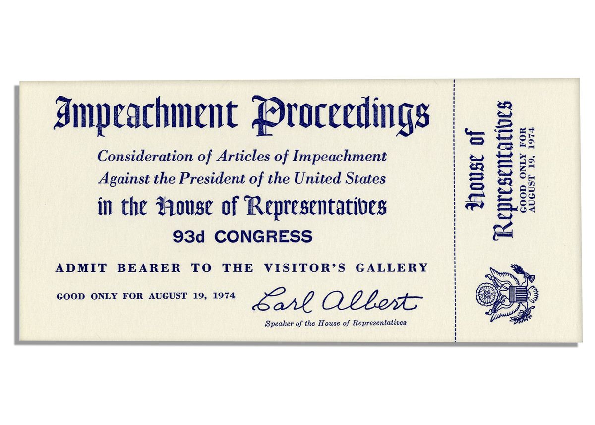 Rare ticket to the U.S. House proceedings for the impeachment trial of President Richard Nixon. Signed in facsimile by Speaker of the House Carl Albert, ticket ''admits bearer to the visitor's gallery'' for the planned date of 19 August 1974. Detachable stub along right side is still present. Nixon's ultimate resignation on 9 August nullified these tickets, which had already been printed. Ticket measures 5'' x 2.75''. Near fine condition.