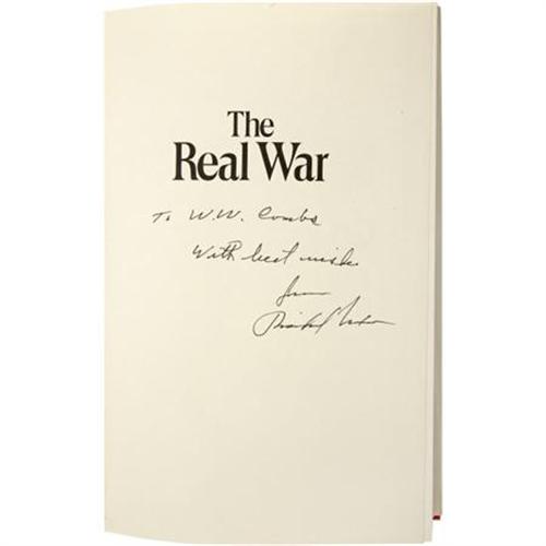 <B>Richard Nixon: Inscribed and Signed </B></I><B><I>The Real War</B></I></B></I> (New York: Warner Books, 1980), first edition, 341 pages, red-cloth binding with silver and black lettering, illustrated endpapers, 8vo (9.25” x 6”), dust jacket (in protective cover). A prolific writer, former President Richard Nixon completed ten books, including his memoirs and several volumes on foreign affairs. <I>The Real War</B></I> focuses on his assertion that, at the close of the 1970s, the U.S. was losing what he described as “World War III.” The half-title page is inscribed and signed in full <I>“To W. W. Combs / With best wishes from Richard Nixon”</B></I>. The book and dust jacket are in very good condition with minor wear.<BR><BR><b>Shipping:</b> Books & Catalogs (<a target="_blank" href="http://www.heritageauctions.com/common/shipping.php">view shipping information</a>)