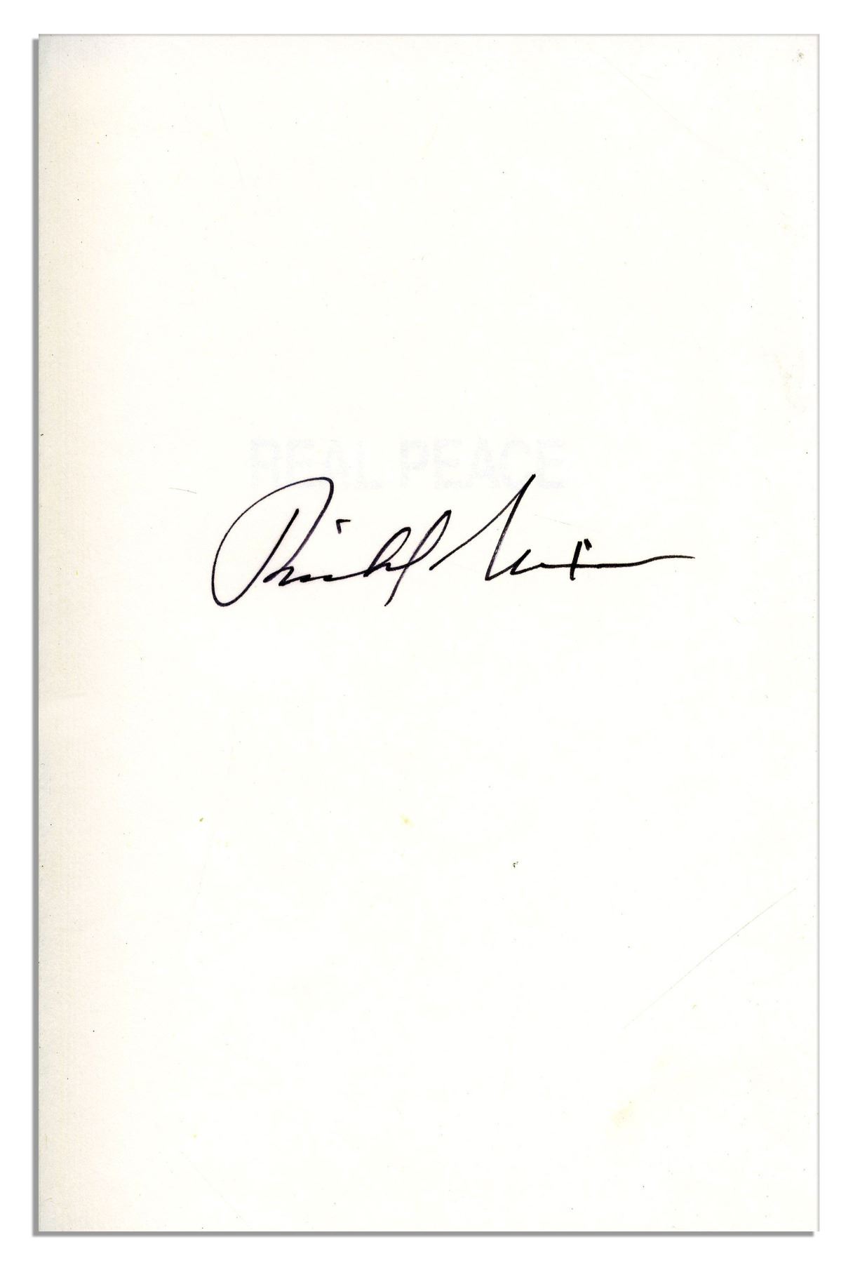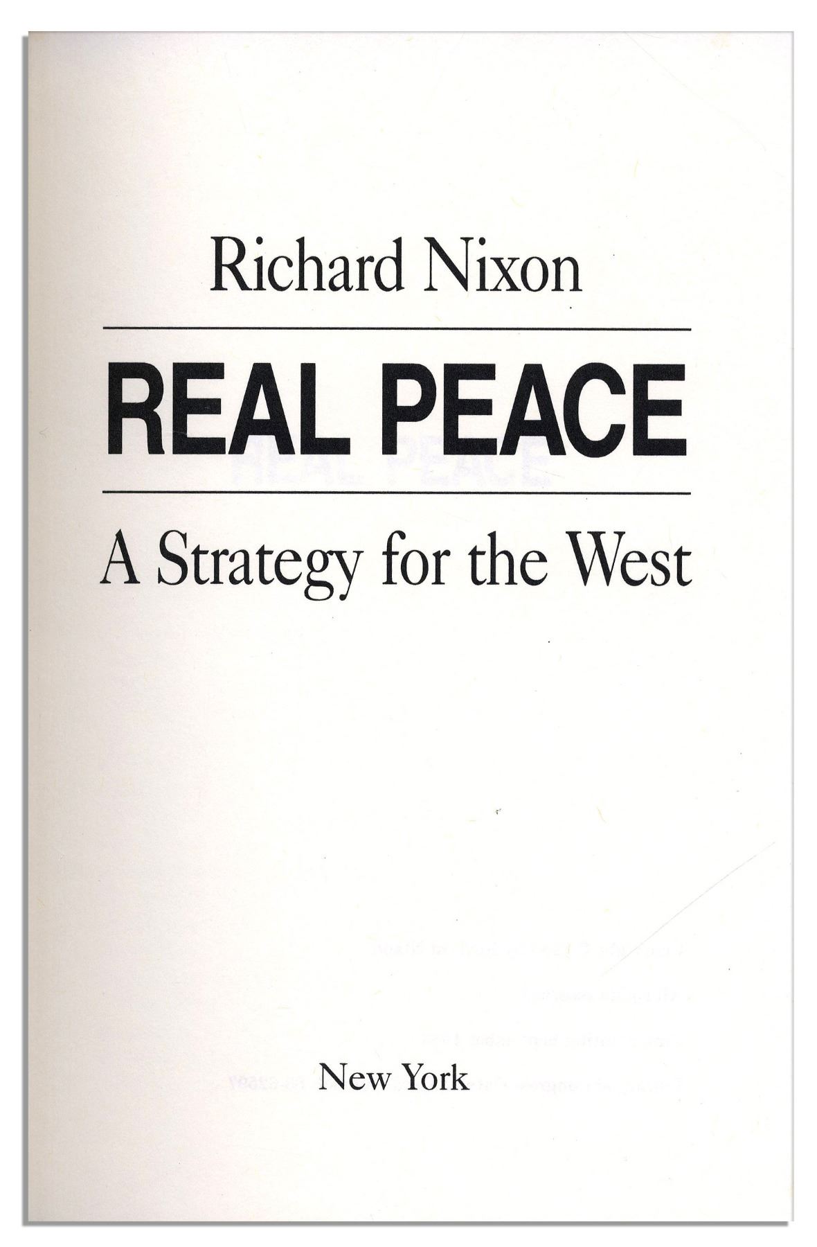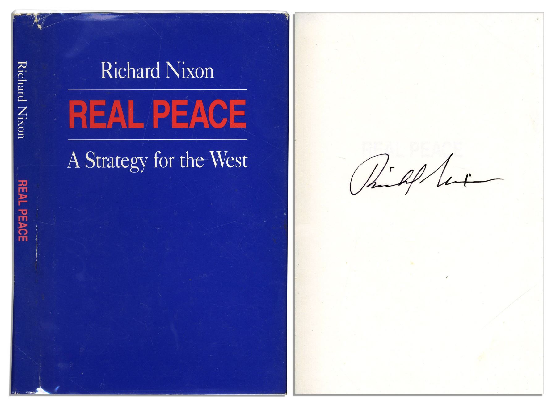 Signed first edition of Richard Nixon's ''Real Peace: A Strategy for the West''. Includes original royal blue dust jacket. Privately published and printed by the former President in 1983. Signed ''Richard Nixon'' on the front free endpaper in bold, black ink. Book measures 5.5'' x 8.5'' in blue boards with gilt lettering. Book is fine. Dust jacket has very light wear to corners and spine edges, otherwise fine.