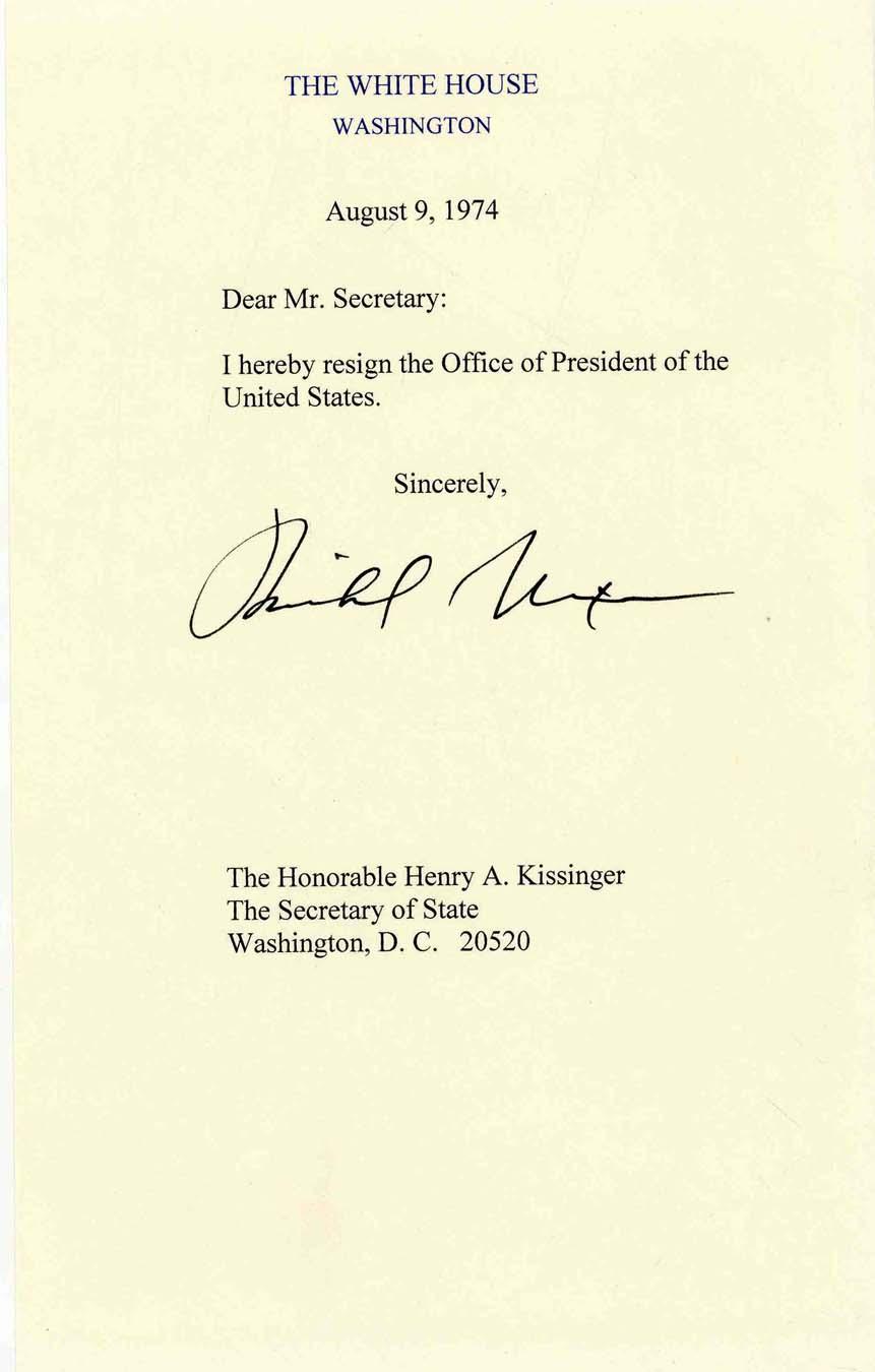 Richard Nixon typed Presidential resignation, signed on replica White House letterhead. Dated 9 August 1974, letter reads in full, ''Dear Mr. Secretary: I hereby resign the office of President of the United States.'' Boldly signed ''Richard Nixon'' at the conclusion. Single page letter measures 6.5'' x 9.5''. As the only Presidential resignation in American history, these highly sought-after souvenir letters are becoming increasingly difficult to find. Fine