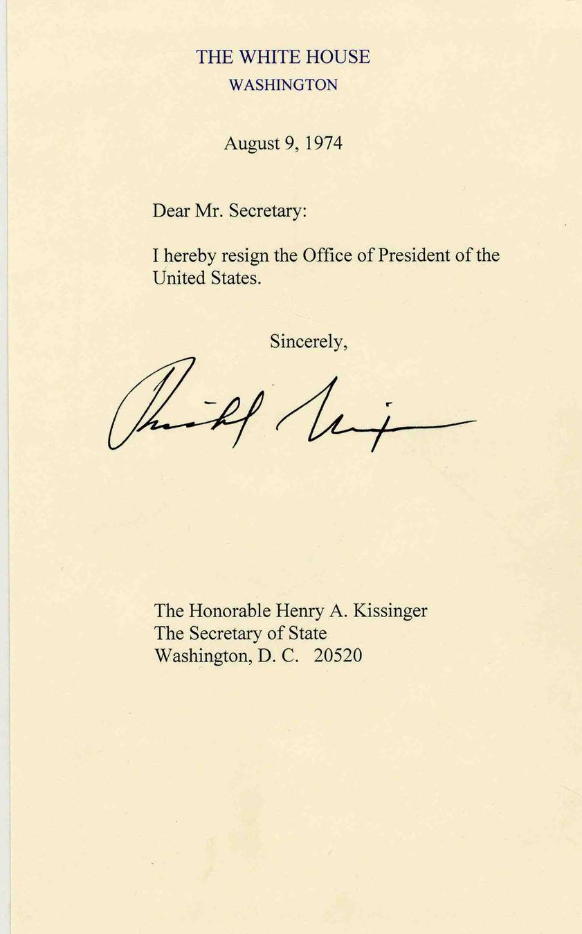 Richard Nixon typed Presidential resignation signed on replica White House letterhead, dated 9 August 1974. Letter reads in full, ''Dear Mr. Secretary: I hereby resign the office of President of the United States.'' Boldly signed ''Richard Nixon'' at the conclusion. Single page letter measures 6.5'' x 9.5''. As the only Presidential resignation in American history, these highly sought-after souvenir letters are becoming increasingly difficult to find. Fine condition.