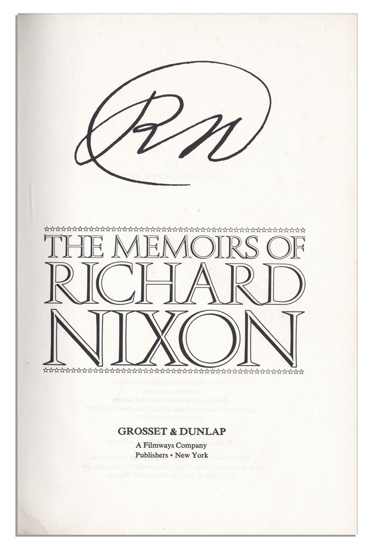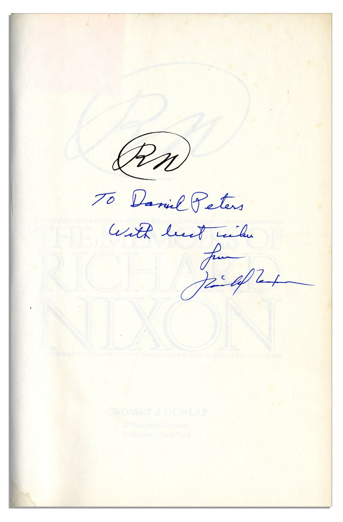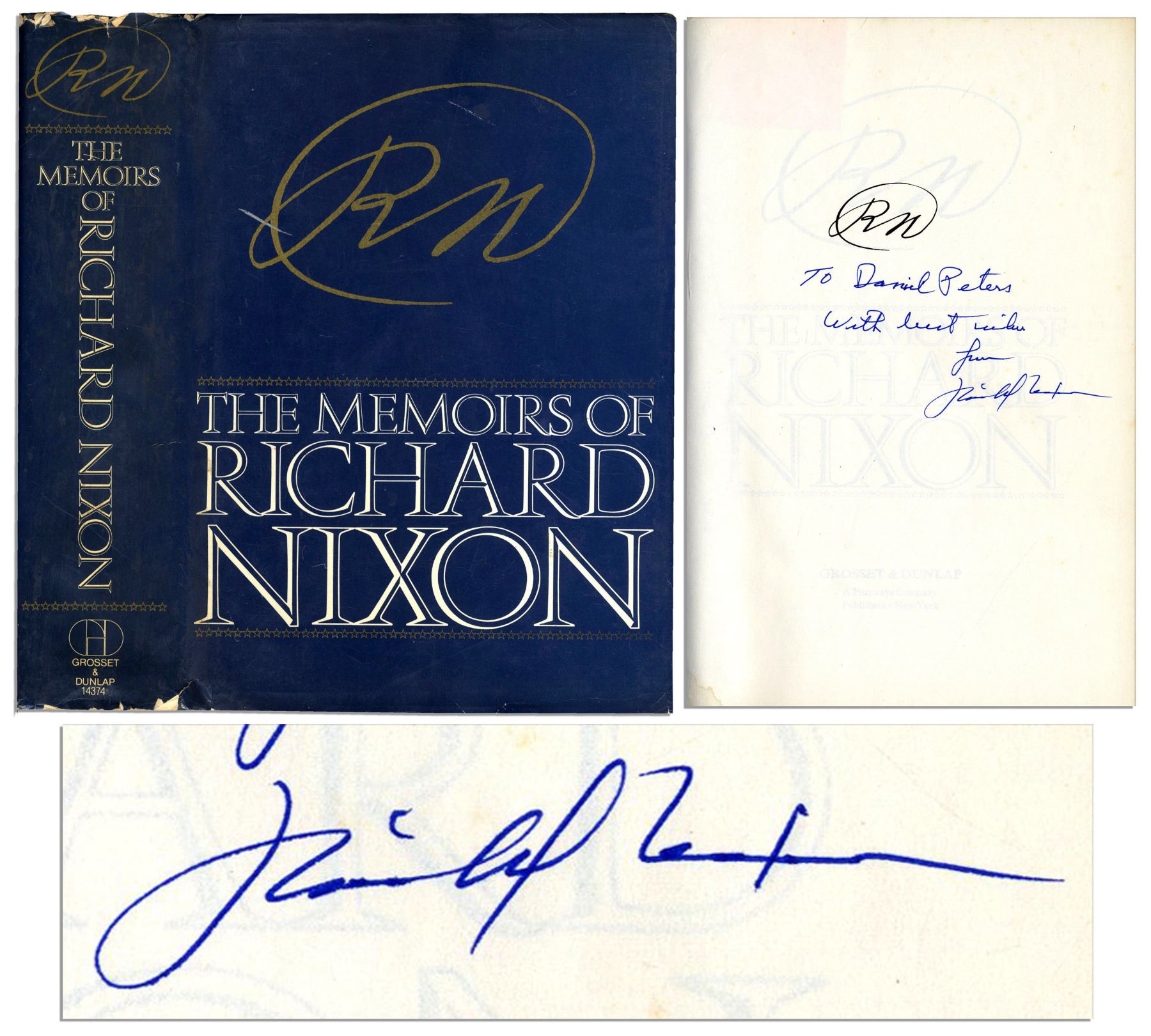 Richard Nixon signed first edition of ''RN: The Memoirs of Richard Nixon''. New York: Grosset & Dunlap, 1978. The former President inscribes the fly-leaf ''To Daniel Peters, With best wishes from Richard Nixon''. This bestselling autobiography is an intensely personal examination of Nixon's life, public career and White House years including the Watergate scandal. 6.5'' x 9.5'' book spanning 1120pp. has some wear to edges of dust jacket, else very good. Some light toning to backstrip, else near fine.