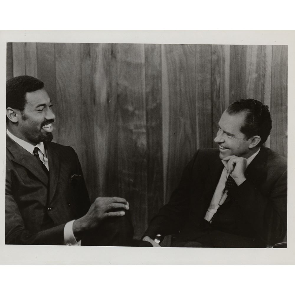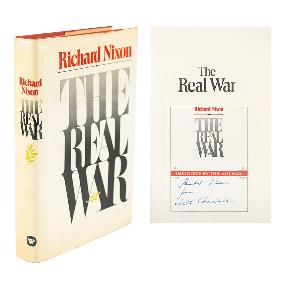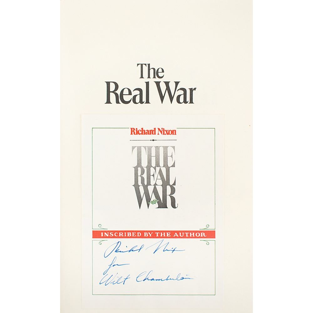 Signed book: The Real War. First edition. NY: Warner Books, 1980. Hardcover with dust jacket, 6.25 x 9.25, 341 pages. Signed and inscribed in blue ink on a bookplate affixed to the half-title page, "Richard Nixon, for Wilt Chamberlain." In fine condition, with some light toning and wear to the dust jacket. Accompanied by a glossy photo of Nixon and Chamberlain in conversation. An appealing association piece between Nixon and Chamberlain, powerful yet divisive figures within their respective realms of sports and politics. Chamberlain, a noted Republican, supported Nixon in the 1968 and 1972 presidential elections and he accompanied Nixon to the funeral of Martin Luther King Jr.