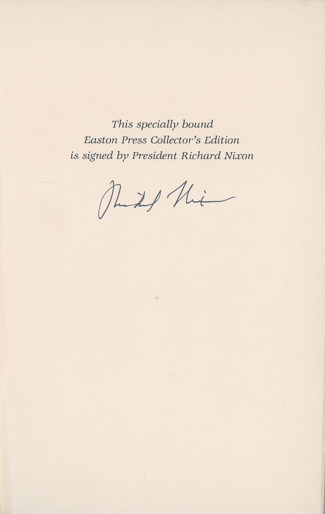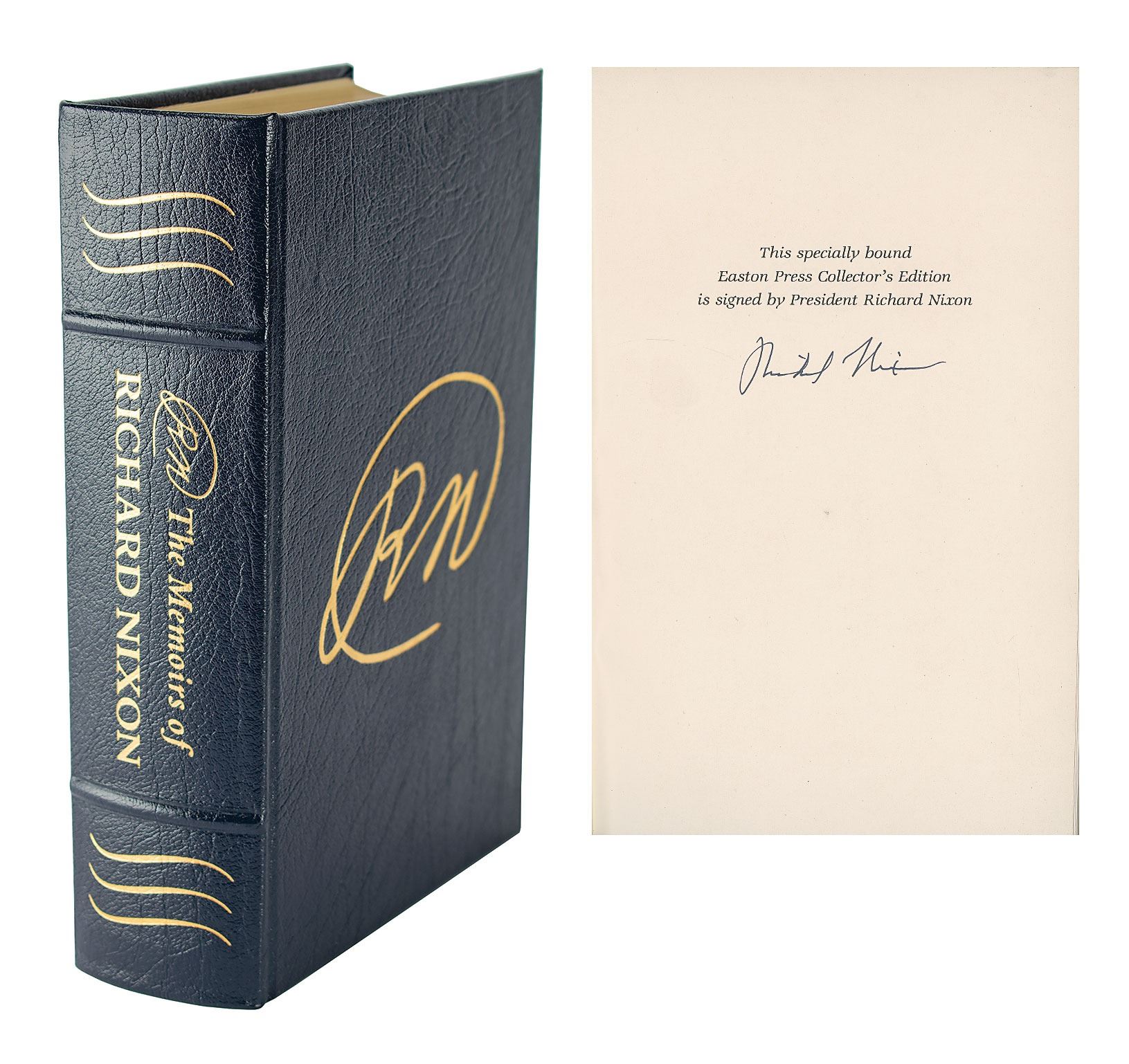Signed book: RN: The Memoirs of Richard Nixon. Collector's edition. Norwalk, Connecticut: Easton Press, 1988. Leather-bound hardcover, 6.5 x 9.5, 1118 pages. Signed in black ink on a specially printed prefatory page by Richard Nixon. In very fine condition.