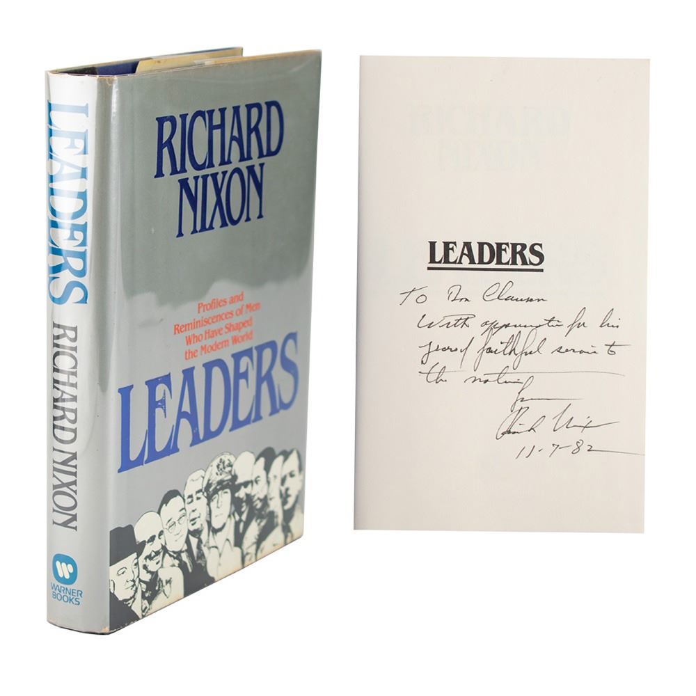 Signed book: Leaders. First edition. NY: Warner Books, 1982. Hardcover with dust jacket, 6.5 x 9.25, 371 pages. Signed and inscribed on the half-title page in black felt tip, "To Don Clausen, With appreciation for his years of faithful service to the nation, from, Richard Nixon, 11-7-82." In fine condition. Accompanied by a full letter of authenticity from JSA. Clausen represented California in Congress from 1963 to 1983.
