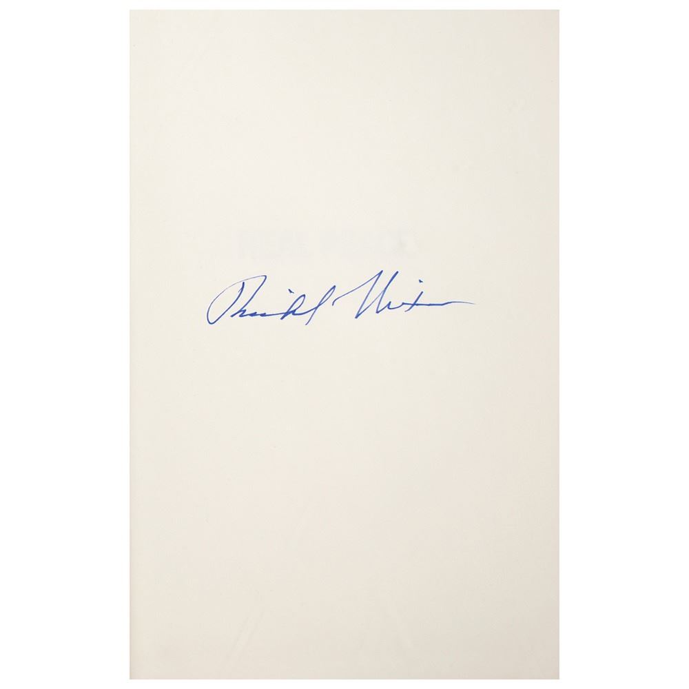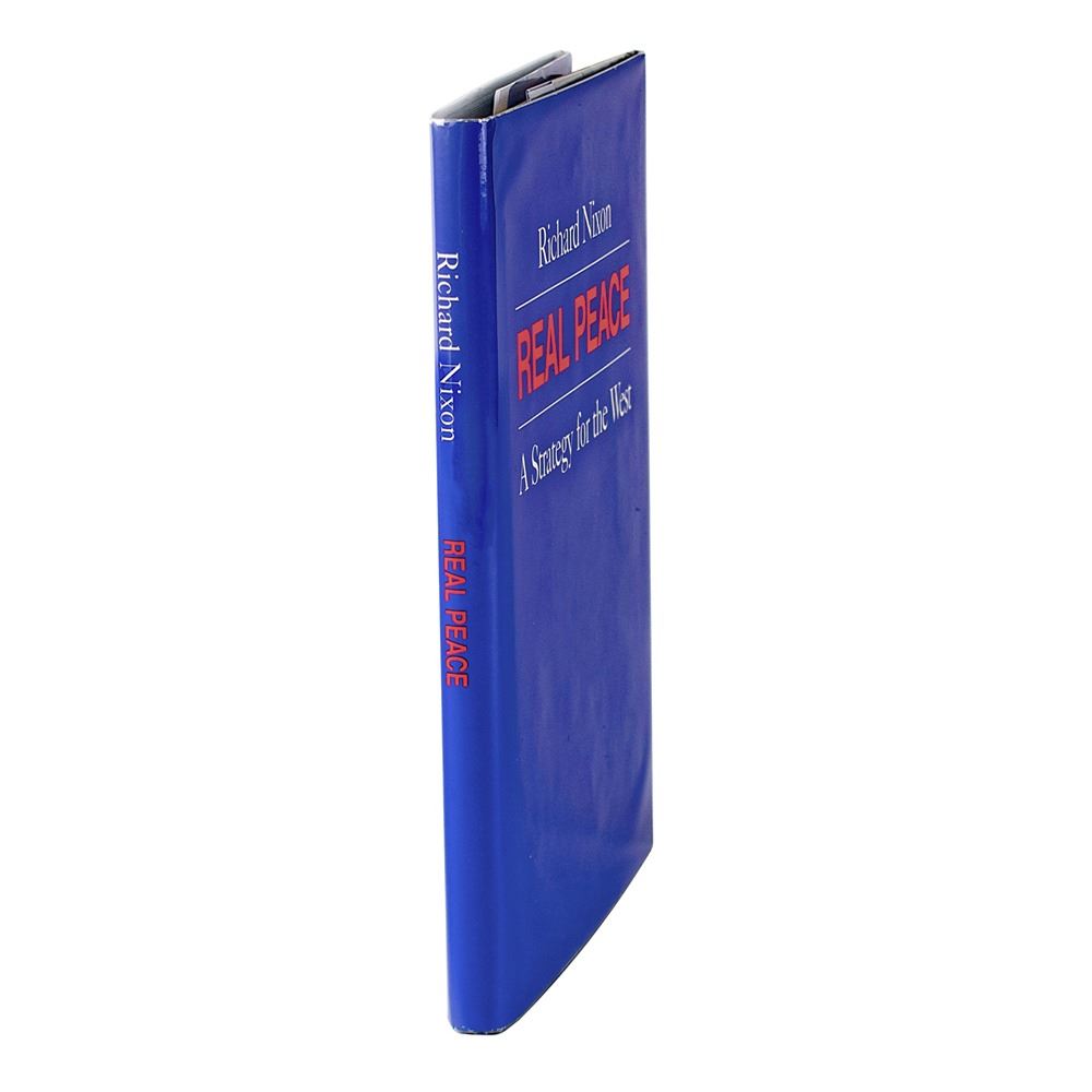 Signed book: Real Peace: A Strategy for the West. First edition, first printing. NY: Privately printed, 1983. Hardcover with dust jacket, 5.75 x 8.5, 106 pages. Boldly signed on the first free end page in blue felt tip by Richard Nixon. In fine condition.