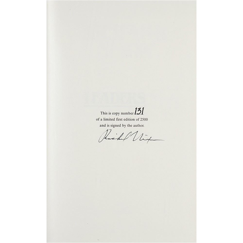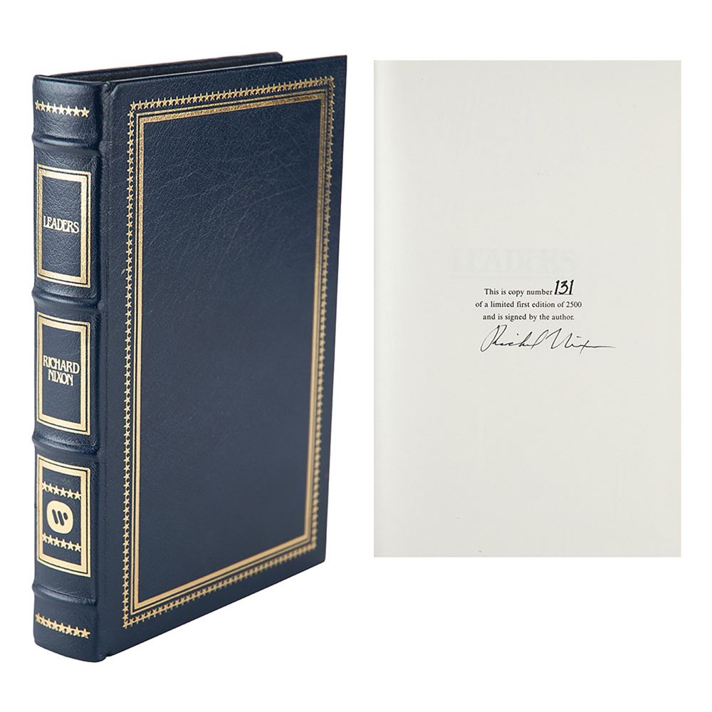 Signed book: Leaders. First edition, limited issue, numbered 131/2500. NY: Warner Books, 1982. Leatherbound hardcover, 6.5 x 9.5, 371 pages. Signed on the colophon in black felt tip, "Richard Nixon." In very fine condition. Accompanied by the publisher's certificate of authenticity.