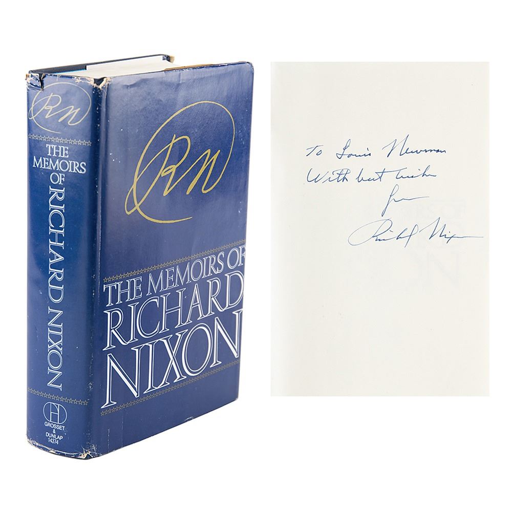 Signed book: The Memoirs of Richard Nixon. Later printing. NY: Grosset & Dunlap, 1978. Hardcover with dust jacket, 6.75 x 9.5, 1120 pages. Signed and inscribed on a free end page in ink, "To Louis Newman, With best wishes from Richard Nixon." In fine condition, with light wear and short edge tears to the dust jacket.