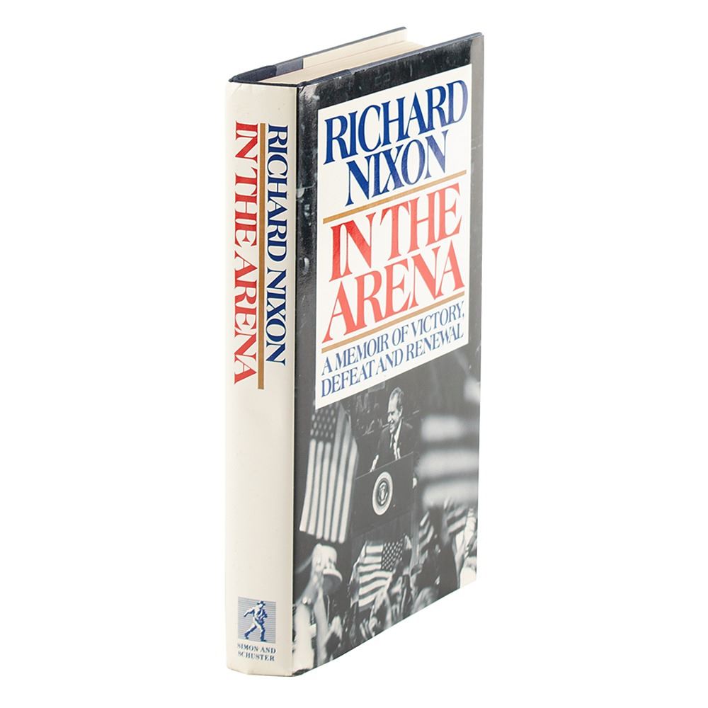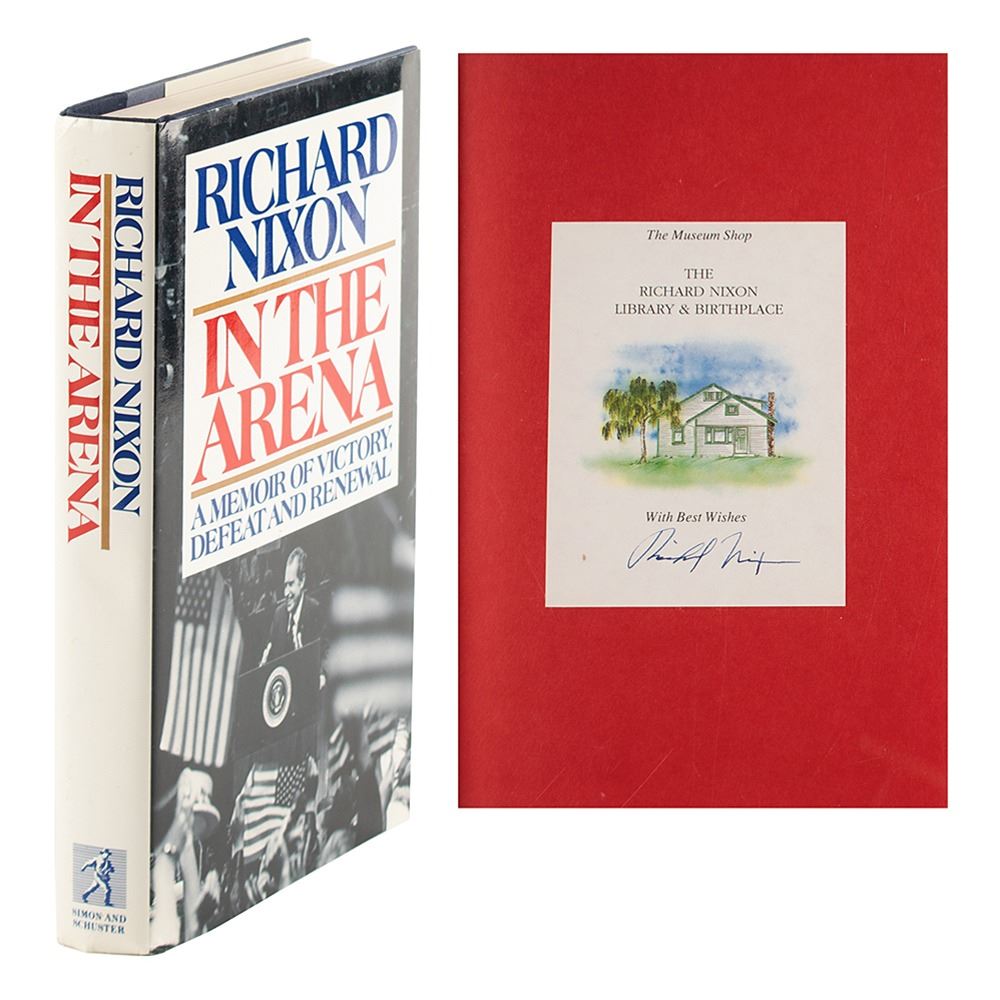 Signed book: In the Arena. First edition. NY: Simon & Schuster, 1990. Hardcover with dust jacket, 6.5 x 9.5, 384 pages. Signed on a Nixon Library & Birthplace bookplate affixed to the first free end page in blue ink by Richard Nixon. In fine condition.