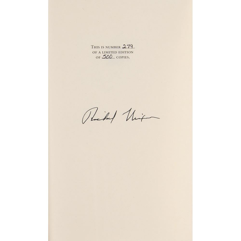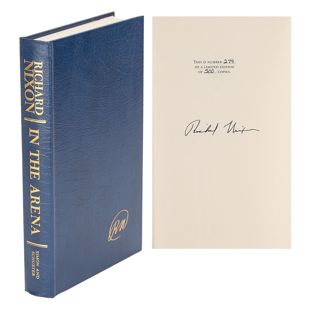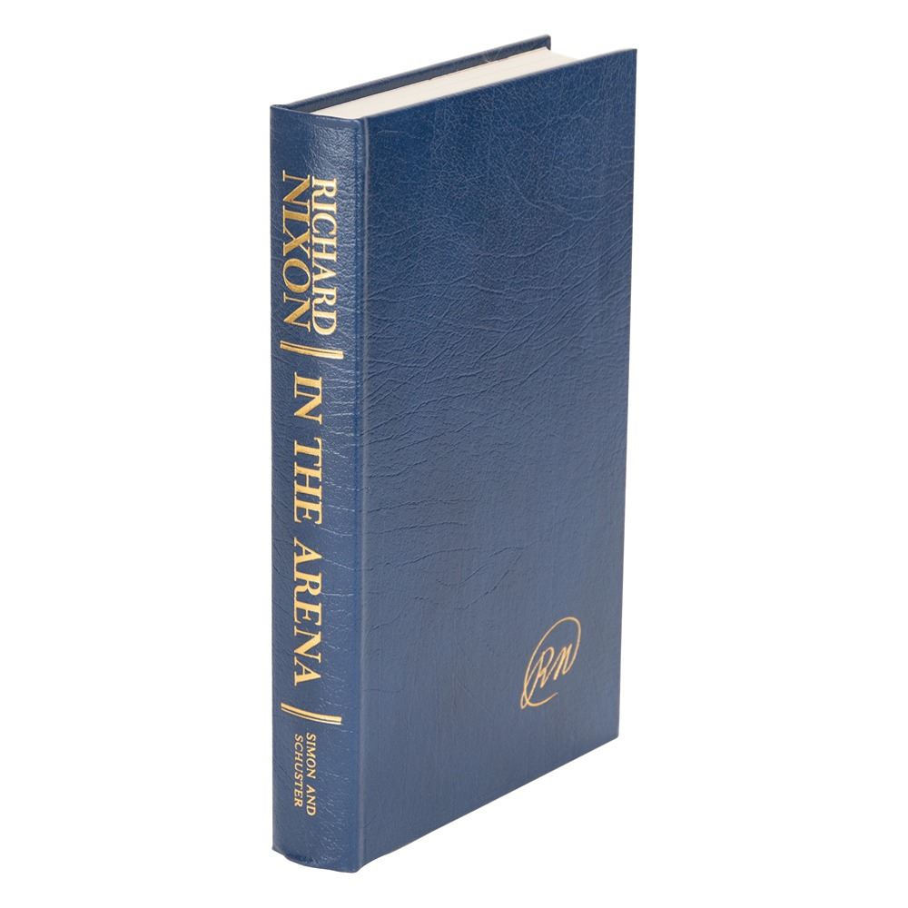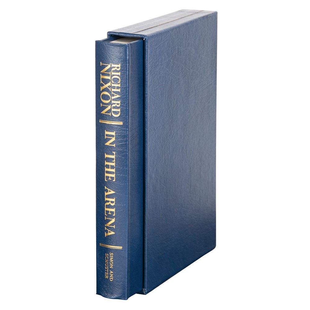 Signed book: In the Arena. First edition, limited issue, numbered 279/500. NY: Simon & Schuster, 1990. Leather-bound hardcover with slipcase, 6.75 x 9.75, 384 pages. Signed on the colophon in black ink by Nixon. In fine condition, with some scuffs to slipcase spine.