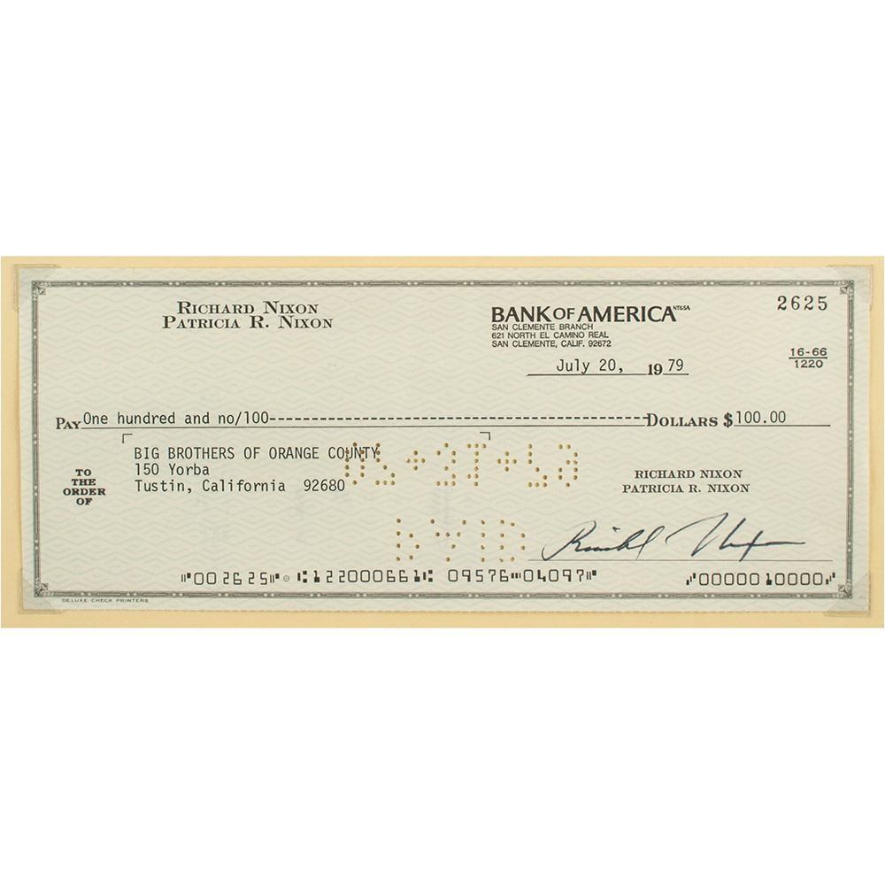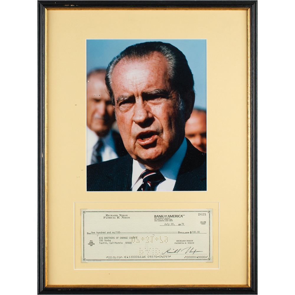 Personal check, 8.25 x 3.5, filled out in type and signed by Richard Nixon, payable to Big Brothers of Orange County for $100, July 20, 1979. Mounted, matted, and framed with a photo of Nixon to an overall size of 14 x 18.75. In fine condition.