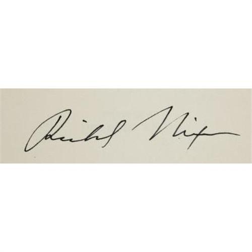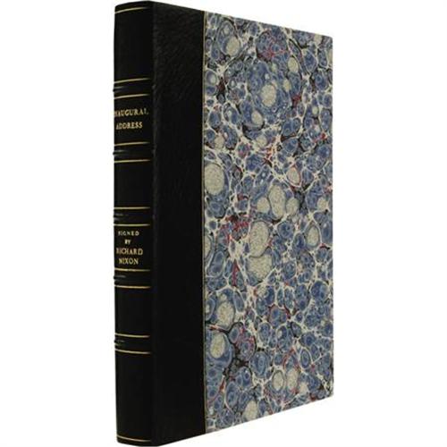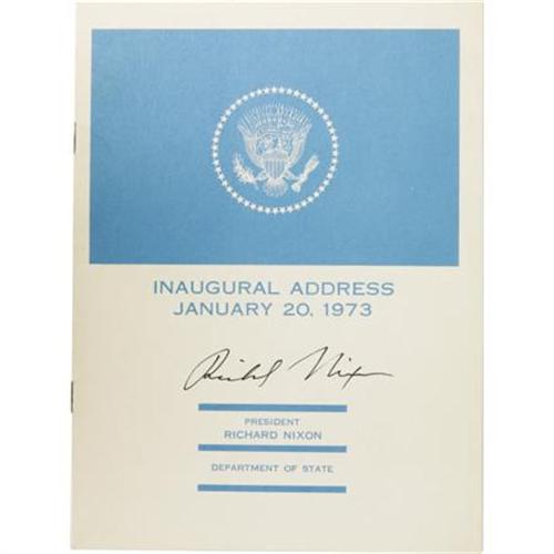 <B>Richard Nixon: Signed Copy of His 1973 Inaugural Address.</B></I> (Washington D.C.: U.S. Government Printing Office, January, 1973), 7 pages, staplebound in wrappers, 5.75" x 7.75". Signed "<I>Richard Nixon</B></I>" on the front cover. President Nixon delivered his second inaugural address on January 20, 1973, just five days after suspending offensive action in North Vietnam. A week later, on January 27, Nixon announced the end of American involvement in Vietnam with the signing of the Paris Peace Accords. What was surely a successful couple of weeks surrounding Nixon's second inaugural came crashing down later in 1973 when the president's involvement in the Watergate cover-up became public knowledge. The copy of the second inaugural address presented here is in fine condition, with no noticeable flaws. It is housed in a blue display folder with gilt spine titles, which is in turn stored in a beautiful custom quarter leather slipcase with gilt spine lettering, five raised spine bands, and marbled boards.<BR><BR><b>Shipping:</b> Books & Catalogs (<a target="_blank" href="http://www.heritageauctions.com/common/shipping.php">view shipping information</a>)