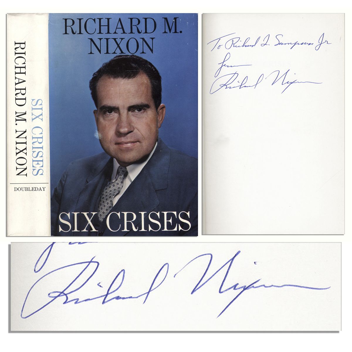 Richard Nixon signed ''Six Crises.'' Doubleday & Co., Inc.: New York: 1962. The only President to resign from office inscribes the front free endpaper: ''To Richard L. Sampour Jr / from / Richard Nixon'' in blue ink. Nixon here recounts the half dozen landmark events that characterized his political career before he was ever elected President, including the Hiss case and the communist riot that almost killed him in Caracas, Venezuela. Measures 6.25'' x 9.5''. Runs 460pp. Bound in grey cloth boards with blue print and gilt lettering. Near fine. With dustjacket in very good condition.