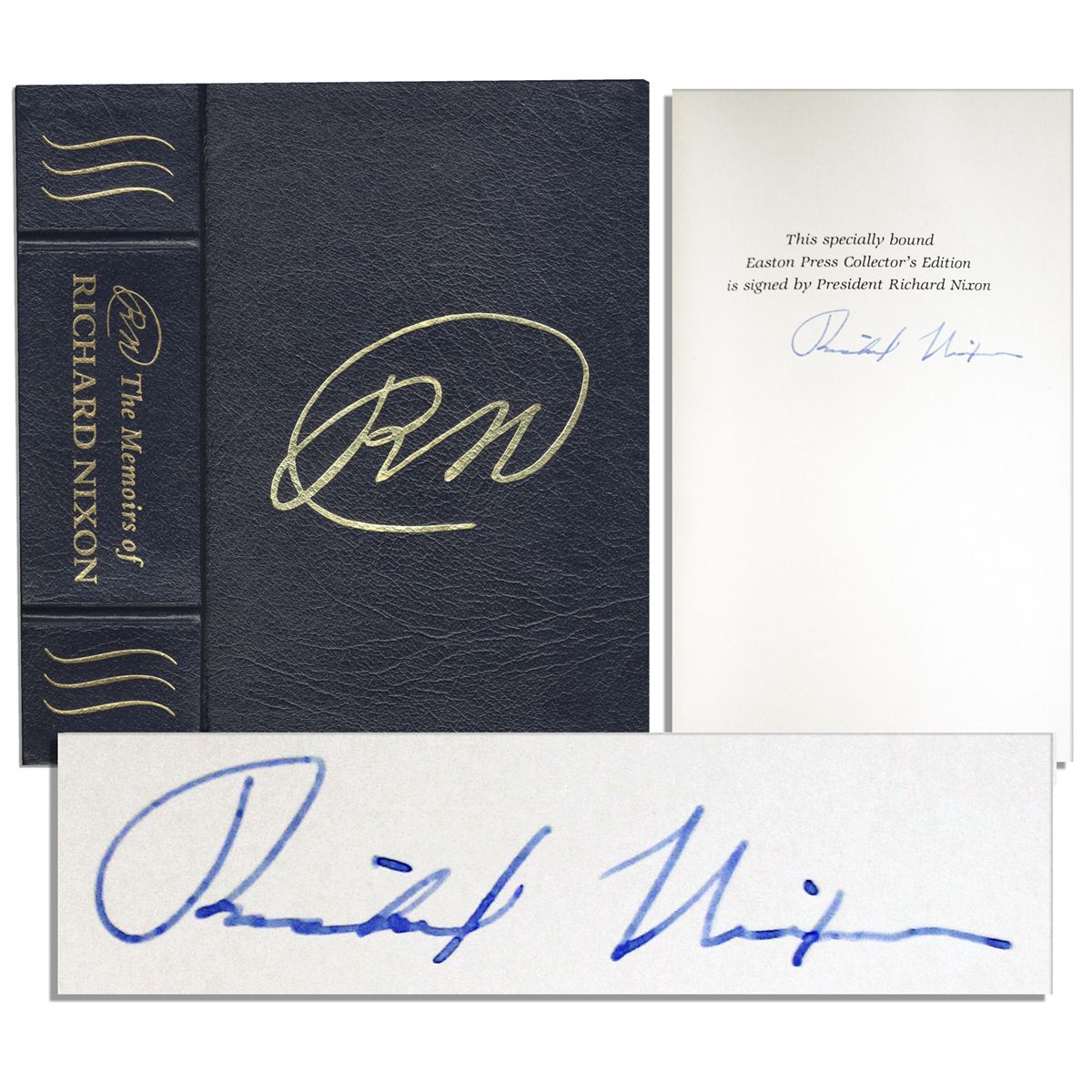 Richard Nixon signed leather bound edition of ''The Memoirs of Richard Nixon'', published by The Easton Press: Norwalk, CT: 1978. The former President signs, ''Richard Nixon'' upon the dedication page. This bestselling autobiography examines Nixon's life, public career and White House years including the Watergate scandal. Edition includes a special introduction booklet by Raymond K. Price, Jr., one of President Nixon's closet advisers and his senior speechwriter. Leather-bound book with gilt edges measures 6.25'' x 9.5'' and runs 1,118pp. Very light wear to small portion of the board edges, else unread condition.