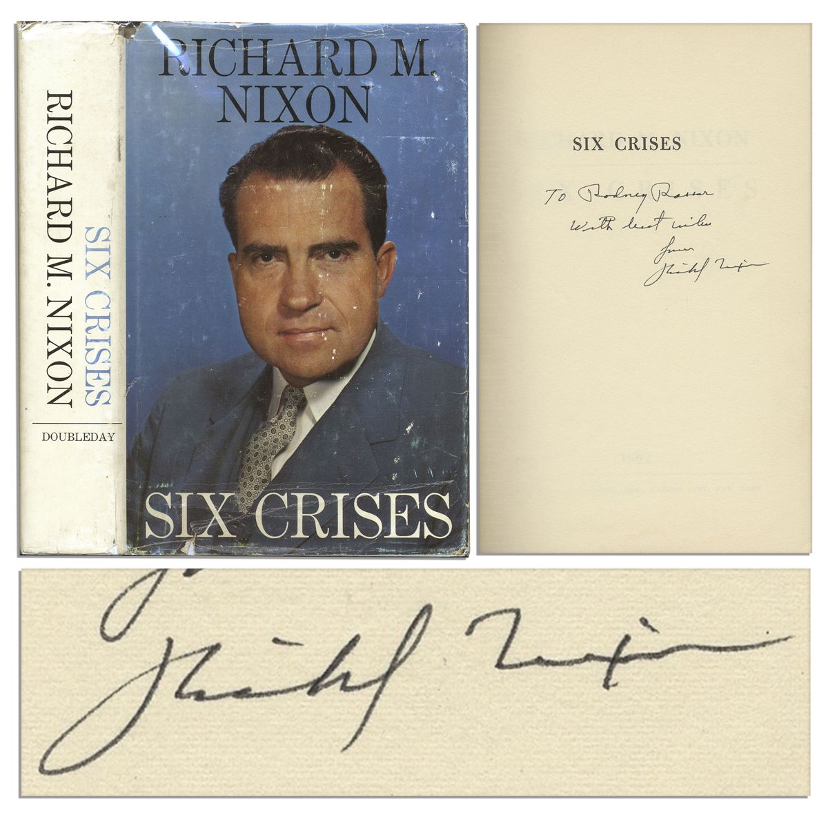 Richard Nixon signed ''Six Crises.'' Doubleday & Co., Inc.: New York: 1962. The only President to resign from office inscribes the fly-leaf: ''To Rodney Rasser / with best wishes / from / Richard Nixon'' in black ink. Nixon here recounts the half dozen landmark events that characterized his political career before he was ever elected President, including the Hiss case and the communist riot that almost killed him in Caracas, Venezuela. Measures 6.25'' x 9.5'' and runs 460pp. Bound in grey cloth boards with blue print and gilt lettering. Small stain to upper right of front board and minor edge wear, else near fine. Dustjacket has a prior owner's ink notation to the front flap and shows shelf wear, else near fine.