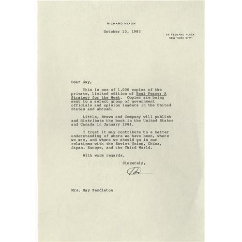<B> Richard Nixon Typed Letter Signed, with Fine Content</B></I> Measuring 7" x 10.5", and written Oct. 10, 1983, from New York City on his personal letterhead. Exteremly fine but for a single center crease for envelope insertion. Signed "<I>RMN</B></I>" in black ink. <BR><BR> This is a cover letter to Mrs. Gay Pendleton which accompanied an advance distribution of Nixon's book, <I>Real Peace: A Strategy for the West.</B></I> He observes that "<I> I trust it may contribute to a better understanding of where we have been, where we are, and where we should go in our relations with the Soviet Union, China, Japan, Europe, and the Third World, </B></I>" Nixon was nothing if not intellectually ambitious!