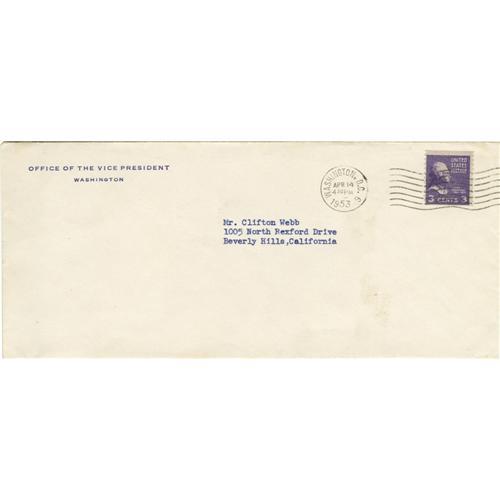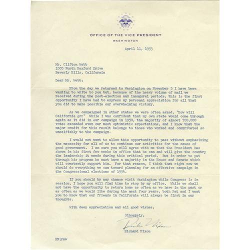<B>Richard Nixon Signed Letter to Clifton Webb.</B></I> A single-page, typed letter on Office of the Vice President stationery, dated April 11, 1953, and signed by the then-V.P. in blue ink. In it, Nixon thanks the actor for contributions to the 1952 election campaign. In Very Fine condition with mailing creases, mild wear and tanning, original mailing envelope included.<BR><BR><b>Shipping:</b> Flat Material, Small (<a target="_blank" href="http://www.heritageauctions.com/common/shipping.php">view shipping information</a>)