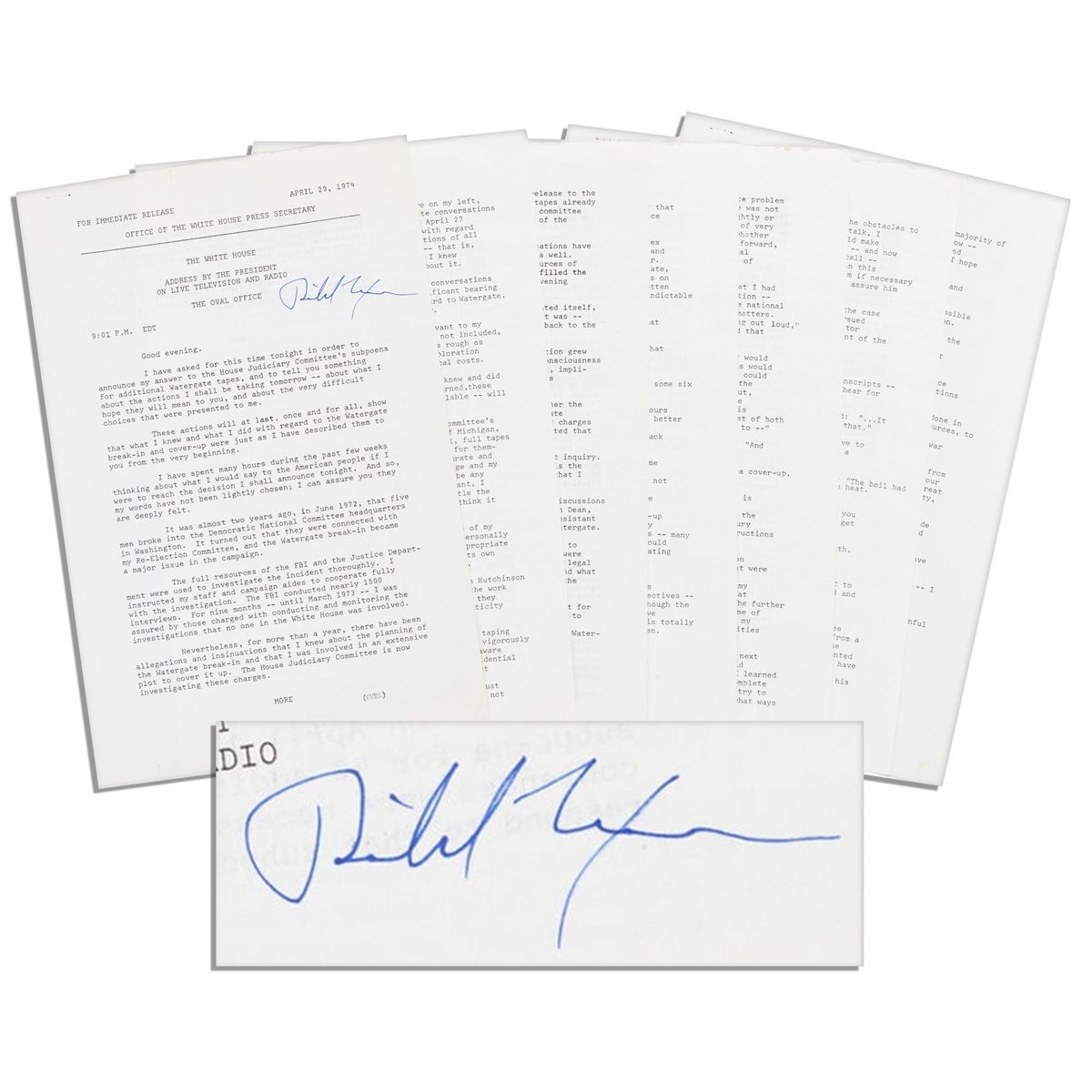 Richard Nixon signed document from the height of the Watergate scandal, dated 29 April 1974. Typed document is signed, ''Richard Nixon'' in blue ink on the first page. Press release contains a transcript of the 36-minute address in which Nixon announced his decision to make public transcripts of White House conversations related to Watergate. Document reads in part, ''...As for myself, I intend to go forward, to the best of my ability with the work that you elected me to do. I shall do so in a spirit perhaps best summed up a century ago by another President, [Abraham Lincoln] 'I do the very best I can; and I mean to keep doing so until the end.'...'' Runs 7pp. and measures 8.5'' x 13''. Toning and staple punctures, else near fine.