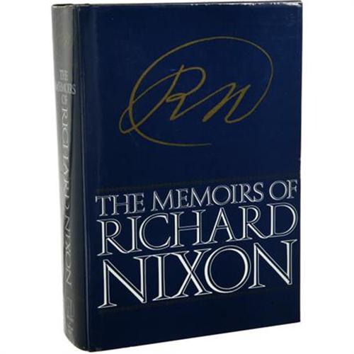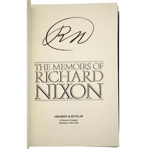 <B>Richard Nixon: Signed <I>The Memoirs of Richard Nixon</B></I>.</B></I> (New York: Grosset & Dunlap, 1978), second printing, 1,120 pages, deep blue cloth with gilt lettering on the spine and front board, 8vo (6.75" x 9.5"), dust jacket. Signed "<I>Richard Nixon</B></I>" on the half title page. Book is in fine condition, jacket very good.<BR><BR><b>Shipping:</b> Books & Catalogs (<a target="_blank" href="http://www.heritageauctions.com/common/shipping.php">view shipping information</a>)