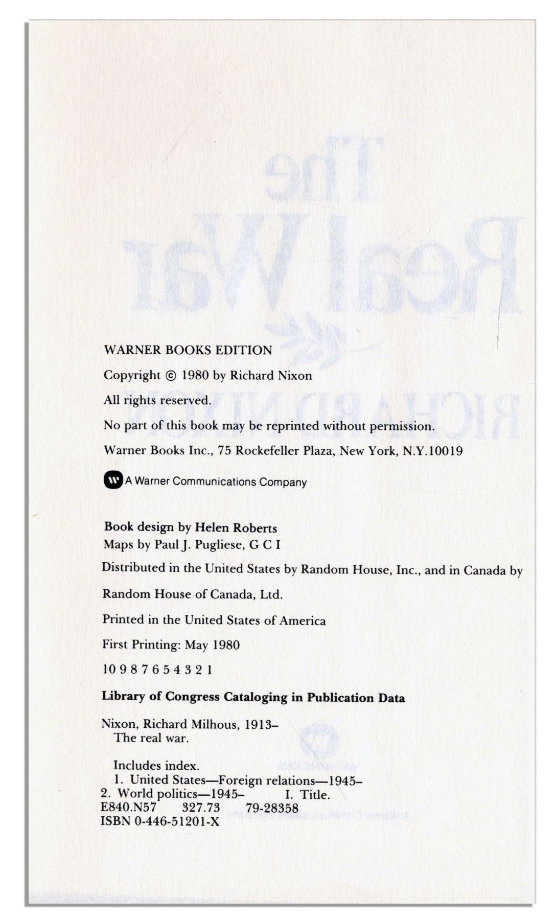 President Richard Nixon signed first edition, first printing of his political tome ''The Real War'' published by Warner Books: New York: 1980. A ''Real War'' bookplate affixed to the fly-leaf is inscribed to the historian Adam Ulam: ''Richard Nixon / for / Adam Ulam''. A slip is also included from the Warner Brothers Trade Division explaining that the book is a review copy and: ''We would appreciate 2 copies of reviews or mentions of this title.'' Runs 341pp. and measures 6.25'' x 9.5''. Bound in red cloth boards with silver lettering Includes original unclipped dustjacket with $12.50 price intact. The slightest wear to boards and a pencil smudge to the fore-edge. Very light rippling to fly-leaf where bookplate is affixed. Near fine overall. Dustjacket is near fine.