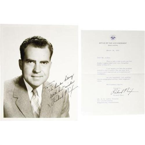 <B>Richard Nixon Typed Letter Signed and Signed Photo,</B></I> TLS, one page on Vice Presidential letterhead, 8vo (7"'x 9"), Washington, D.C., March 24, 1956, responding to a request for an autographed photo. Excellent condition with original mailing cover carrying a free-frank autopen signature. Included is the referenced photo, an 8" x 10" ISP reading, "<I>To The Lincoln Library With best wishes Richard Nixon</B></I>". Excellent condition. <I>From the collection of Henry E. Luhrs.</B></I><BR><BR><b>Shipping:</b> Flat Material, Small (<a target="_blank" href="http://www.heritageauctions.com/common/shipping.php">view shipping information</a>)