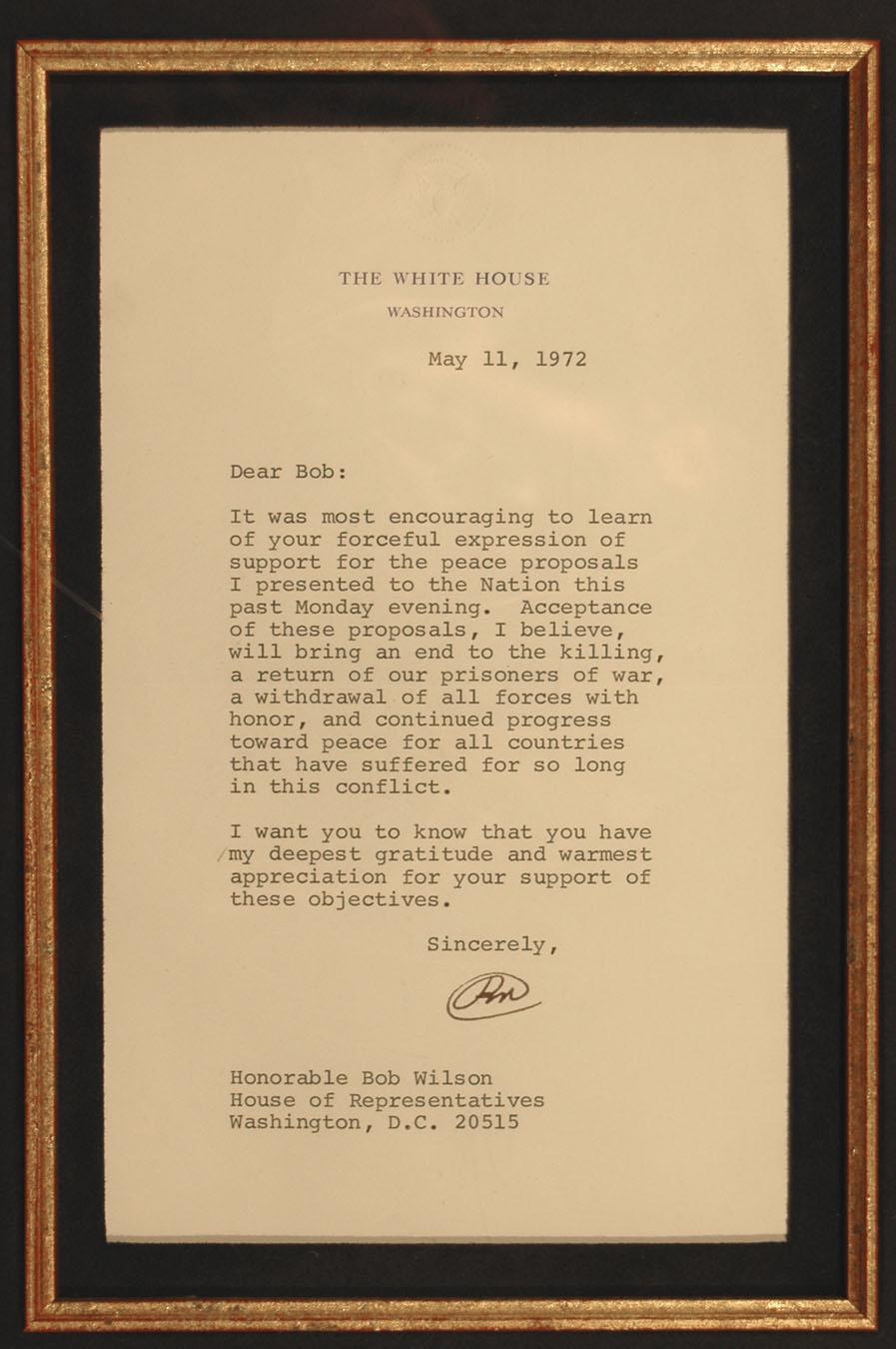 President Richard Nixon typed letter signed to conservative Congressman Bob Wilson. Composed on White House stationery and dated 11 May 1972, Nixon thanks Congressman Wilson for his support of the Vietnam peace proposal presented days earlier at Nixon's re-election conference. In part: ''It was most encouraging to learn of your forceful expression of support of the peace proposals I presented to the Nation this past Monday evening. Acceptance of these proposals, I believe, will bring an end to the killing, a return of our prisoners of war, a withdrawal of all forces with honor, and continued progress toward peace for all countries that have suffered for so long in this conflict. I want you to know that you have my deepest gratitude and warmest appreciation for your support of these objectives…'' Framed & matted with clipped signatures of both the President & first lady as well as a photograph and two plaques. Measures 23.25'' x 23'' overall. Fine condition.