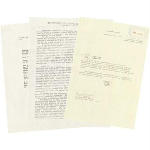 <B>Richard Nixon Typed Letter Signed "</B></I><B><I>RN</B></I></B></I><B>."</B></I> One page, 6.75" x 9" on his personal letterhead, Woodcliff Lake, New Jersey, September 26, 1990 to William G. Hyland, Editor of <I>Foreign Affairs</B></I>. Adding "<I>Dear Bill</B></I>" in his own hand Nixon writes, "<I>In view of the incredibly naive appraisals of Gorbachev's proposed economic reforms which have appeared in most of the prestige media, I thought you might find it refreshing to see a more realistic analysis of recent developments in the Soviet Union. The memorandum was prepared by Monica Crowley, a recent Colgate graduate, who has joined my staff as a foreign policy consultant.</B></I>" Accompanied by Hyland's response together with Crowley's memorandum in which she takes Gorbachev to task on his reform attempts: "<I>...Gorbachev had the opportunity to choose between either free-markets or central planning. He did not. He is depending on hi style of leadership to carry him through this controversy. But he cannot apply a political solution to an economic crisis.</B></I>.." Light horizontal creases, staple holes at top left, else very fine condition.<BR><BR><BR><b>Shipping:</b> Flat Material, Small (<a target="_blank" href="http://www.heritageauctions.com/common/shipping.php">view shipping information</a>)