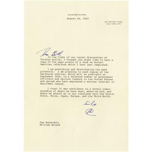 <B>Richard Nixon Typed Letter Signed "</B></I><B><I>RN</B></I></B></I><B>."</B></I> One page, 6.75" x 9" on his personal letterhead with autograph emendations, Woodcliff Lake, New Jersey, August 26, 1983 to William G. Hyland, Editor of <I>Foreign Affairs</B></I>. He writes, in part: "<I>In light of our recent discussion on foreign policy, I thought you might like to have a copy of the page proofs of a book on Soviet-American relations which I have just completed. I am publishing and distributing the book privately. I am planning to send copies of the hardcover edition, which will be available on September 10th, to a selected number of government officials and opinion leaders in the United States and abroad who have expressed a serious interest in East / West issues...</B></I>" Light horizontal creases, else very fine condition.<BR><BR><BR><b>Shipping:</b> Flat Material, Small (<a target="_blank" href="http://www.heritageauctions.com/common/shipping.php">view shipping information</a>)