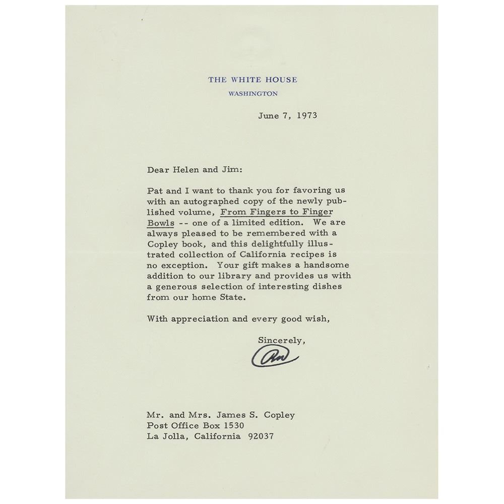 TLS as president signed ‰ÛÏRN,‰Û one page, 6.75 x 8.75, White House letterhead, June 7, 1973. Letter to journalist and newspaper publisher James S. Copley, in part: "Pat and I want to thank you for favoring us with an autographed copy of the newly published volume, From Fingers to Finger Bowls." In fine condition. Accompanied by the original mailing envelope.