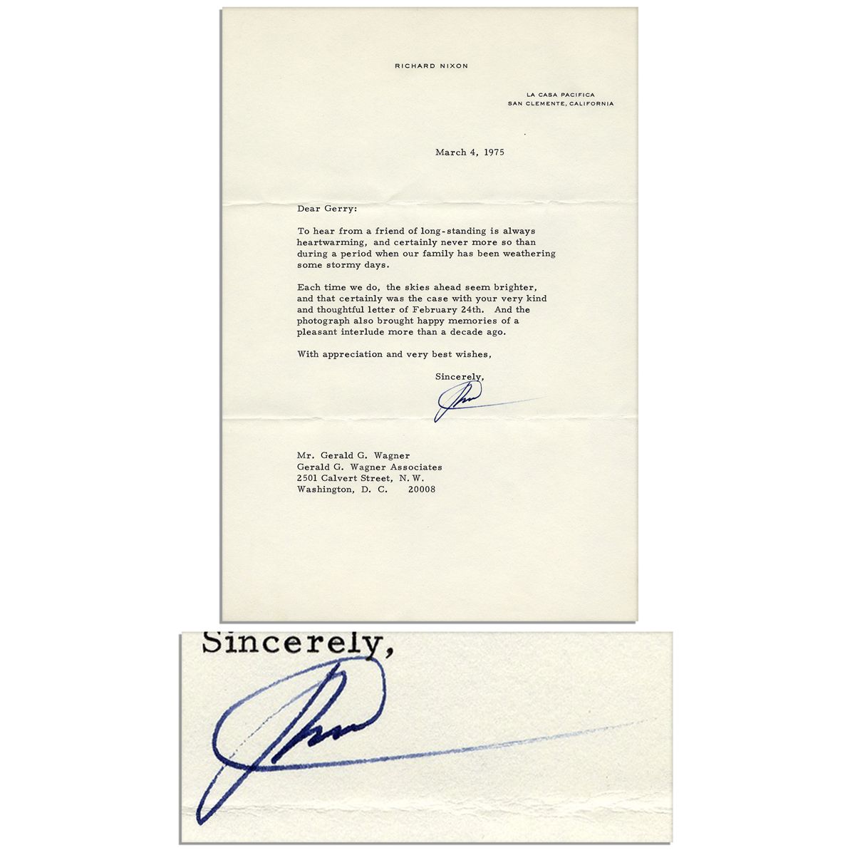 Richard Nixon typed letter signed, ''RN''. Letter is dated 4 March 1975, less than one year after he resigned the Presidency. Upon his personal stationery, Nixon writes to a Gerald G. Wagner, in full, ''Dear Gerry: To hear from a friend of long-standing is always heartwarming, and certainly nevermore so than during a period when our family has been weathering some stormy days. Each time we do, the skies ahead seem brighter, and that certainly was the case with your very kind and thoughtful letter of February 24th. And the photograph also brought happy memories of a pleasant interlude more than a decade ago.'' For many years, Wagner managed a venue in Washington D.C. often used for large events, and knew several Presidents personally. Single-page letter measures 7.25'' x 10.5''. Folds, else near fine.