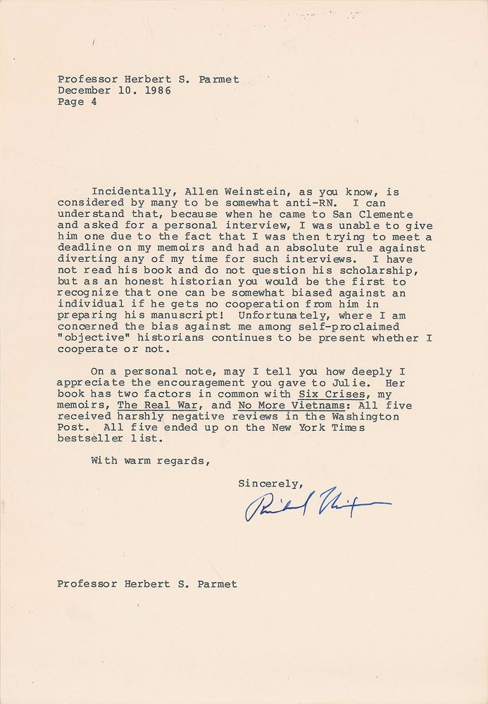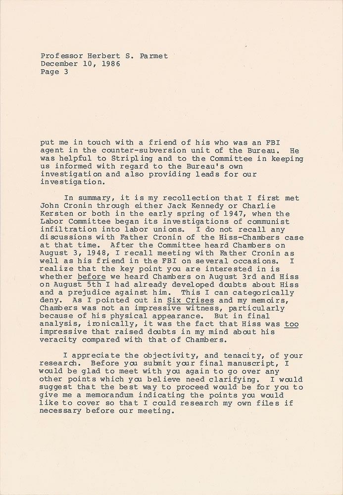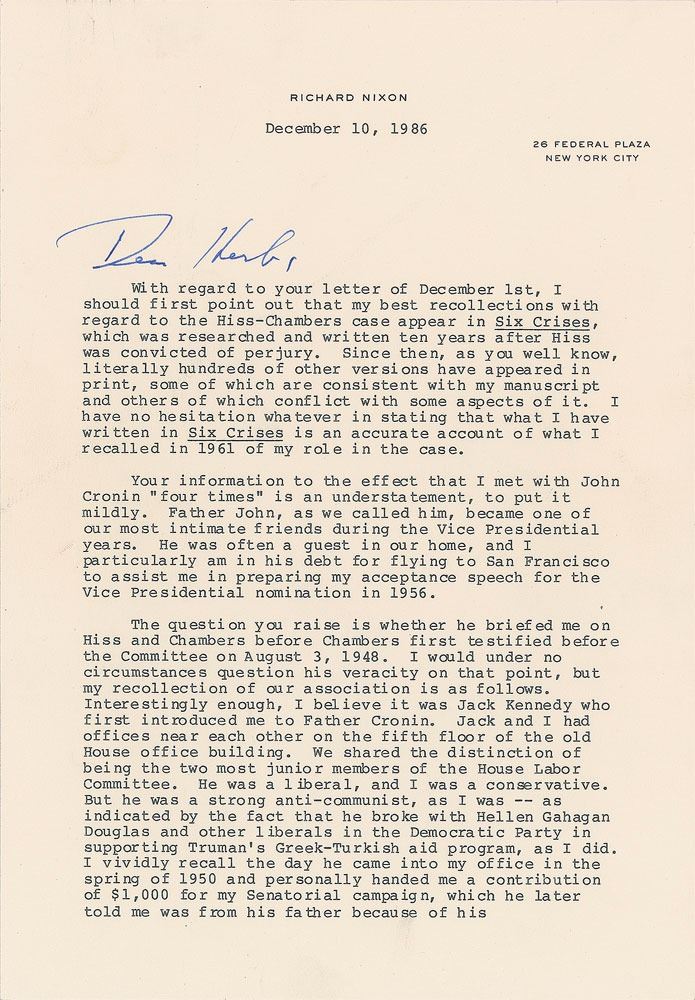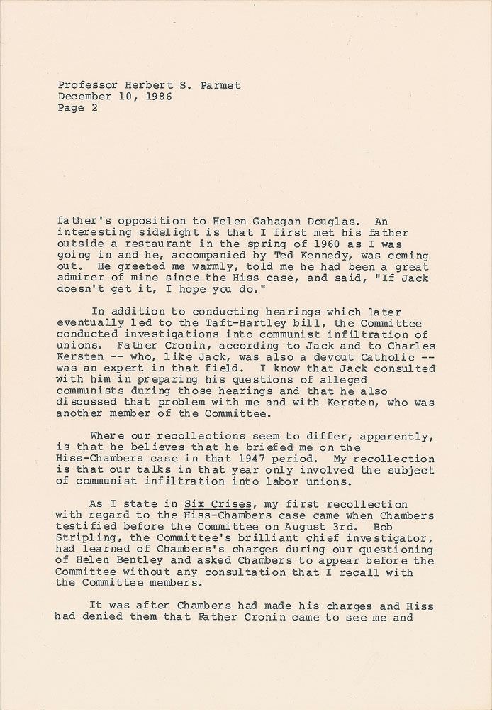 TLS, four pages, 7.25 x 10.5, personal letterhead, December 10, 1986. Lengthy letter to historian Herbert Parmet, in part: "My best recollections with regard to the Hiss-Chambers case appear in Six Crises, which was researched and written ten years after Hiss was convicted of perjury…Your information to the effect that I met with John Cronin 'four times' is an understatement, to put it mildly. Father John, as we called him, became one of our most intimate friends during the Vice Presidential years…Interestingly enough, I believe it was Jack Kennedy who first introduced me to Father Cronin. Jack and I had offices near each other on the fifth floor of the old House office building. We shared the distinction of being the two most junior members of the House Labor Committee. He was a liberal, and I was a conservative. But he was a strong anti-communist, as I was—as indicated by the fact that he broke with Helen Gahagan Douglas and other liberals in the Democratic Party in supporting Truman's Greek-Turkish aid program, as I did. I vividly recall the day he came into my office in the spring of 1950 and personally handed me a contribution of $1,000 for my Senatorial campaign, which he later told me was from his father because of his father's opposition to Helen Gahagan Douglas. An interesting sidelight is that I first met his father outside a restaurant in the spring of 1960 as I was going in and he, accompanied by Ted Kennedy, was coming out. He greeted me warmly, and told me he had been a great admirer of mine since the Hiss case, and said, 'If Jack doesn't get it, I hope you do.' In addition to conducting hearings which later eventually led to the Taft-Hartley bill, the Committee conducted investigations into communist infiltration of unions. Father Cronin, according to Jack and to Charles Kersten—who, like Jack, was also a devout Catholic—was an expert in that field. I know that Jack consulted with him in preparing his questions of alleged communists during those hearings…Where our recollections seem to differ, apparently, is that he believes that he briefed me on the Hiss-Chambers case in that 1947 period. My recollection is that our talks in that year only involved the subject of communist infiltration into labor unions." In fine condition. Nixon's pursuit of the Alger Hiss spy case earned him national attention as a leading anti-communist politician. Kennedy's father, Joseph P. Kennedy, Sr., was known for his friendship with fervent communist hunter Joseph McCarthy, a fellow Irish Catholic. This remarkable, lengthy letter reveals the complex relationship between rivals in the 1960 presidential election, and offers insight into both Kennedy's family and his politics.