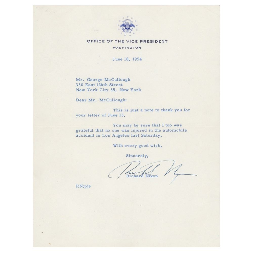 TLS, one page, 7 x 9, Office of the Vice President letterhead, June 18, 1954. Letter to George McCullough in New York, in full: "This is just a note to thank you for your letter of June 13. You may be sure that I too was grateful that no one was injured in the automobile accident in Los Angeles last Saturday." In fine condition.