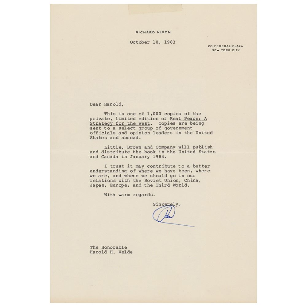 TLS signed ‰ÛÏRN,‰Û one page, 7.25 x 10.5, personal letterhead, October 10, 1983. Letter to former Illinois congressman Harold H. Velde, in part: "This is one of 1,000 copies of the private, limited edition of Real Peace: A Strategy for the West. Copies are being sent to a select group of government officials and opinion leaders in the United States and abroad‰Û_I trust it may contribute to a better understanding of where we have been, where we are, and where we should go in our relations with the Soviet Union, China, Japan, Europe, and the Third World." In fine condition.