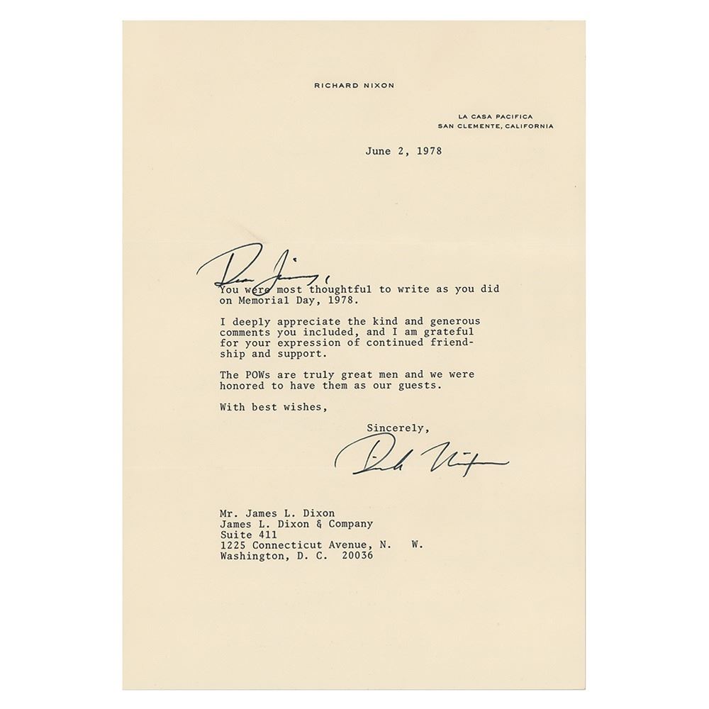 TLS signed “Dick Nixon,†one page, 7.75 x 10.5, June 2, 1978. Letter to James L. Dixon, in part: “You were most thoughtful to write as you did on Memorial Day, 1978. I deeply appreciated the kind and generous comments you included…The POWs are truly great men and we were honored to have them as our guests.†Nixon adds the salutation in his own hand, "Dear Jimmy." In fine condition. Accompanied by the original mailing envelope, bearing a pre-printed free frank.
