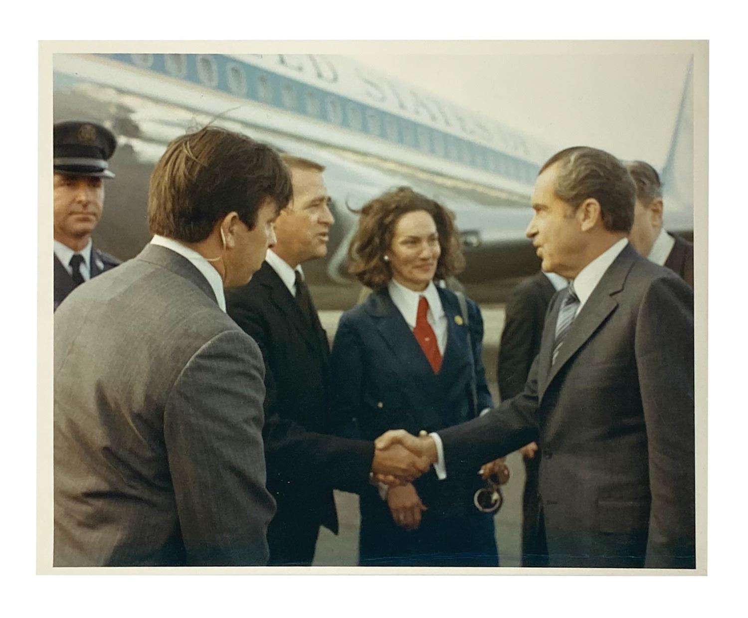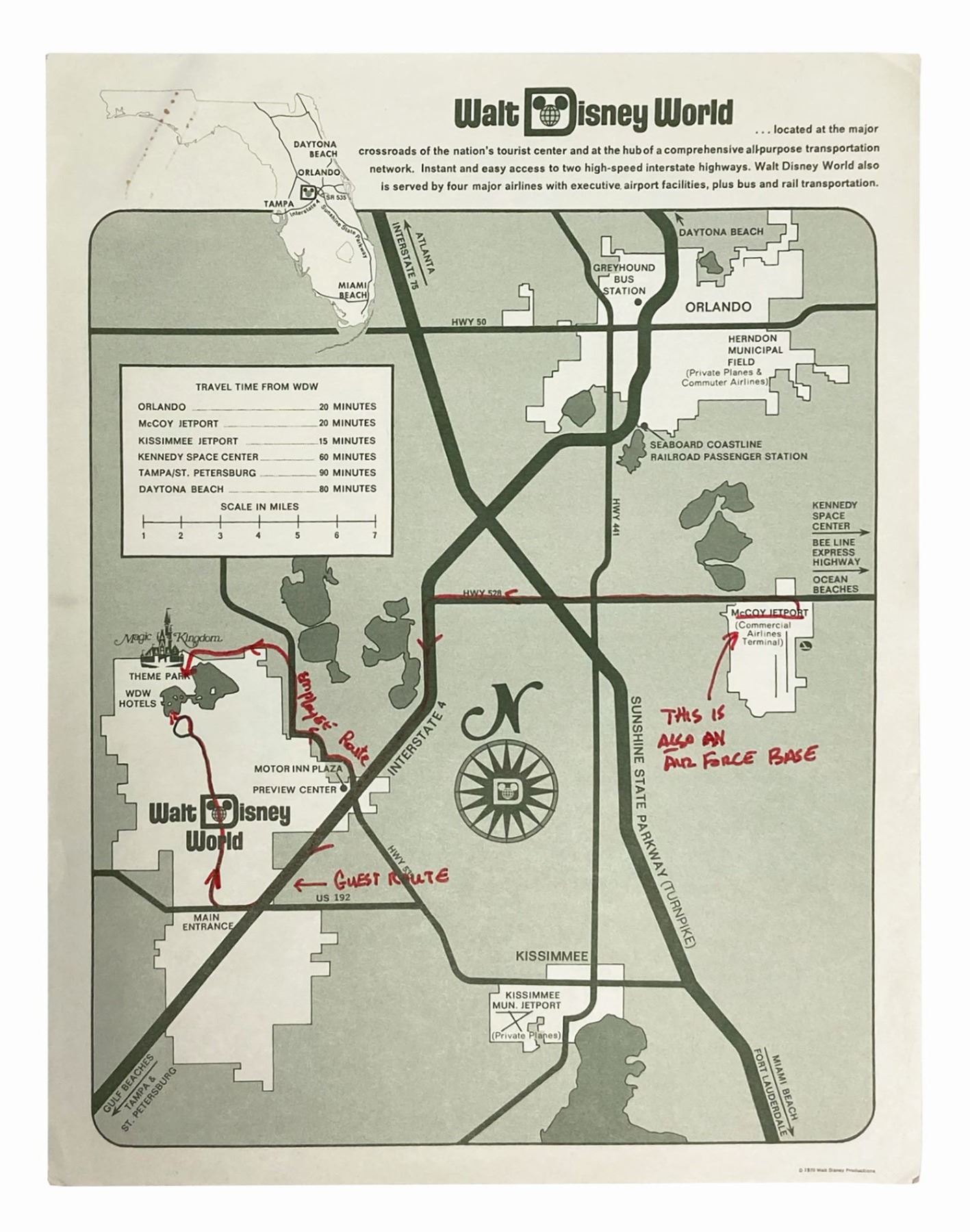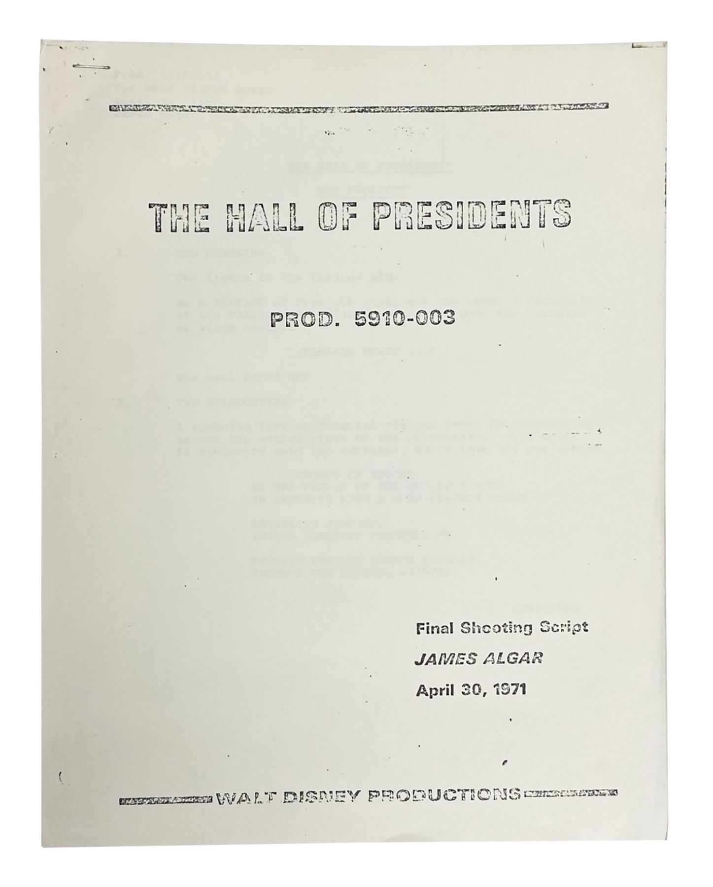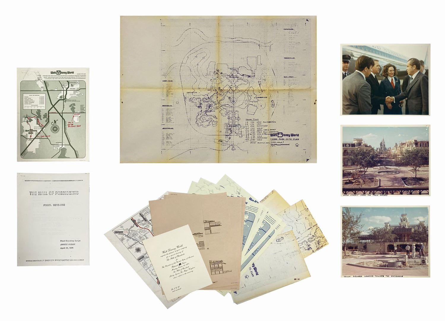 (Walt Disney World, 1971) A collection of ephemera relating to President Richard Nixon's proposed visit to Walt Disney World ahead of the Opening Spectacular and Dedication in October of 1971. The collection comes from the personal collection of Nixon's White House advance man Jon A. Foust. The archive provides a unique window into the early days of Walt Disney World and the incredible diligence, planning, and politics that go into anything a sitting president does in public. Highlights include a sample invitation for a special showing of The Hall of Presidents for President Richard Nixon; a copy script of the Hall of Presidents presentation for approval by the White House; an original typed memorandum on White House letterhead stationery proposing the president visit the resort as it "would make a terrific color story which would have broad appeal to all ages," and, "It would show the President in an active, fun, and youthful setting which people would enjoy, especially the young;" a 3-page proposed schedule that would have Nixon visiting the park, presenting a White House flown flag to Roy Disney, visiting It's a Small World, and riding the monorail; a theme park site plan blueprint marked with the president's route through the park; (2) color photographs of Town Square in Main Street USA under construction; and a photograph back stamped "Official Photograph The White House" depicting Nixon shaking hands with dignitaries on an airport tarmac with Air Force One. The balance consists of copy White House memoranda, Walt Disney World event itineraries, White House Communications and Walt Disney Co. rosters and contact sheets, maps of the park and surrounding area, and a restrike photograph of Walt Disney. Items range in size from 7"x5.25" to 18"x24" and are generally in very good condition. Exhibiting some creasing, oxidized staples, edge wear, and handling.