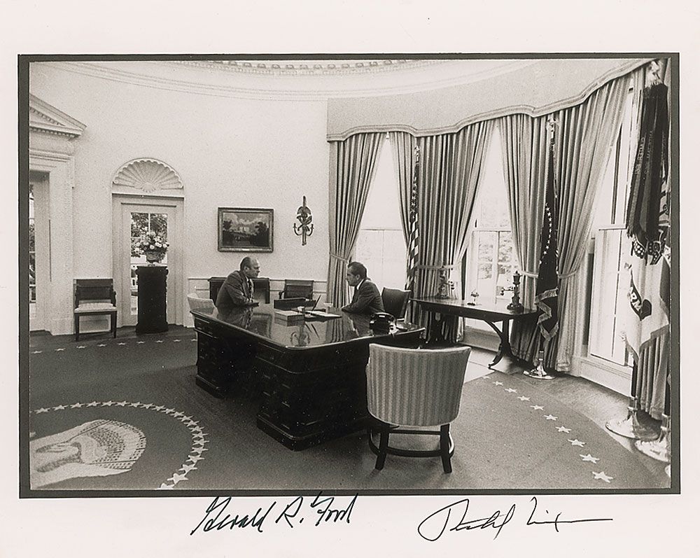 Glossy 10 x 8 photo taken August 8, 1974—the day that Nixon announced his resignation—showing Ford and Nixon discussing the presidential transition in the Oval Office, signed in the lower border in black felt tip by Gerald Ford and Richard Nixon. In very fine condition.