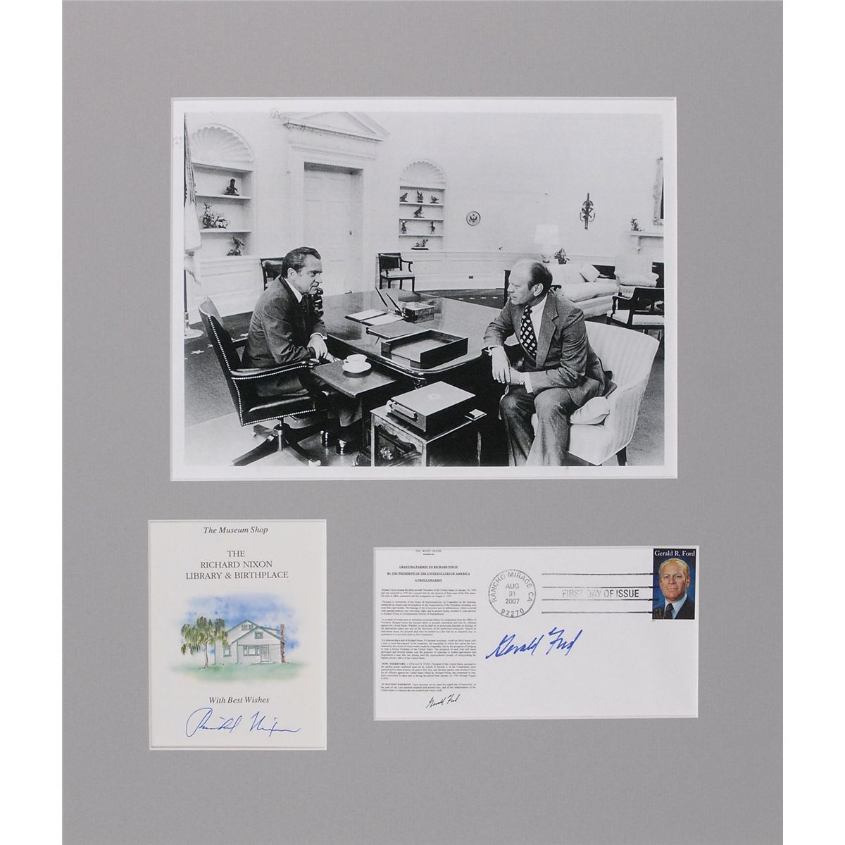 Two items: a Richard Nixon Library & Birthplace Museum bookplate, signed in blue ink, “Richard Nixon”; and an FDC with a cachet reproducing the pardon that President Ford granted to Nixon upon assuming the presidency, signed in blue felt tip, “Gerald R. Ford.” Matted with a photo of the pair working in the White House to an overall size of 14 x 17. In fine condition.