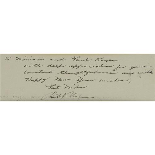 <B>Richard Nixon and Pat Nixon Presidential- Era Signed Photograph</B></I>Color 8" x 10" photo, tipped onto a 9.5" x 12.5" texture board. Inscribed in black ink: "<I> To Miriam and Paul Keyes with deep appreciation for your constant thoughtfulness and with Happy New Year Wishes, Pat Nixon / Richard Nixon.</B></I>" Minor aging to the mat, otherwise very fine. Overall, 11" x 13.5"framed.<BR>Keyes was an entertainment industry figure who was a Republican Party "insider" and fund raiser.